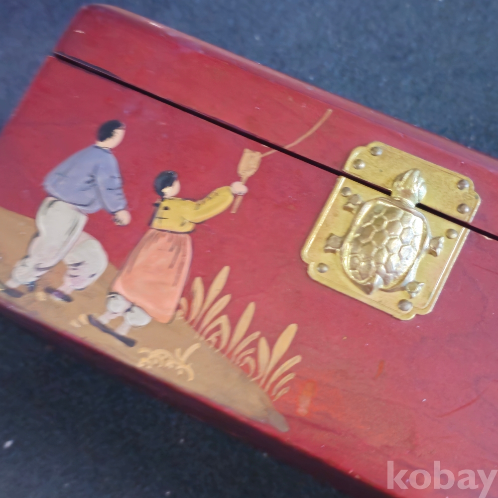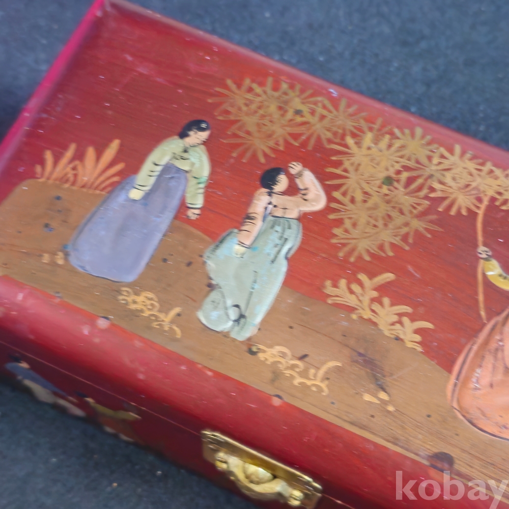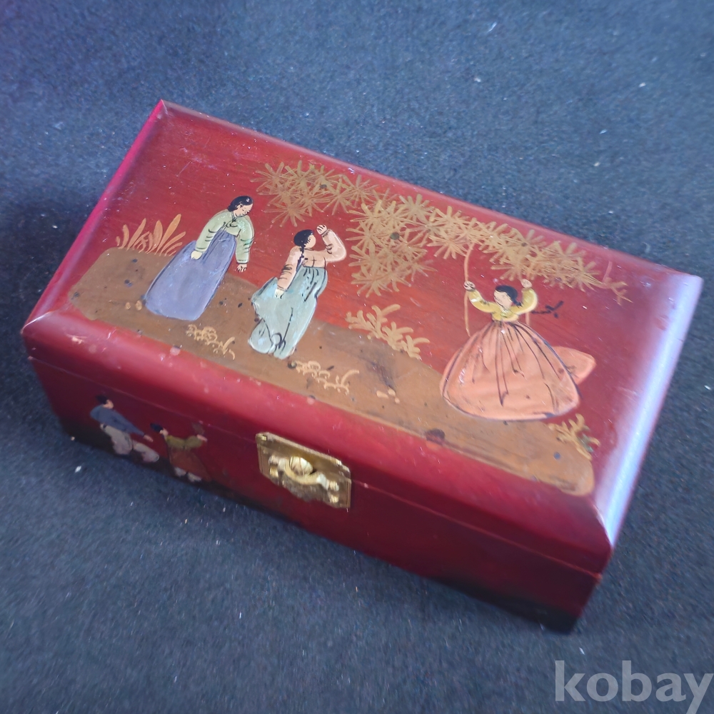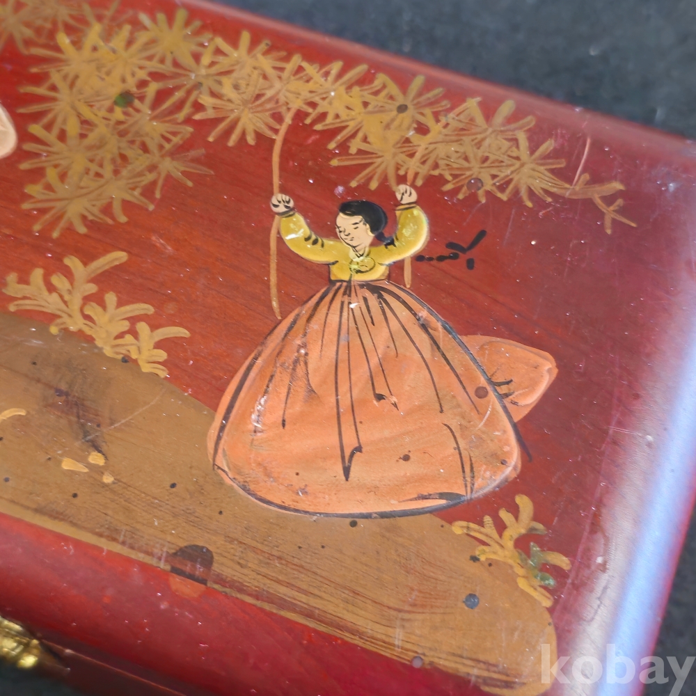 (((근현대사자료))) 오래전 그네타는여인과 연날리는 남여모습이 정겹게 양각되어있는 거울달린 나무 함