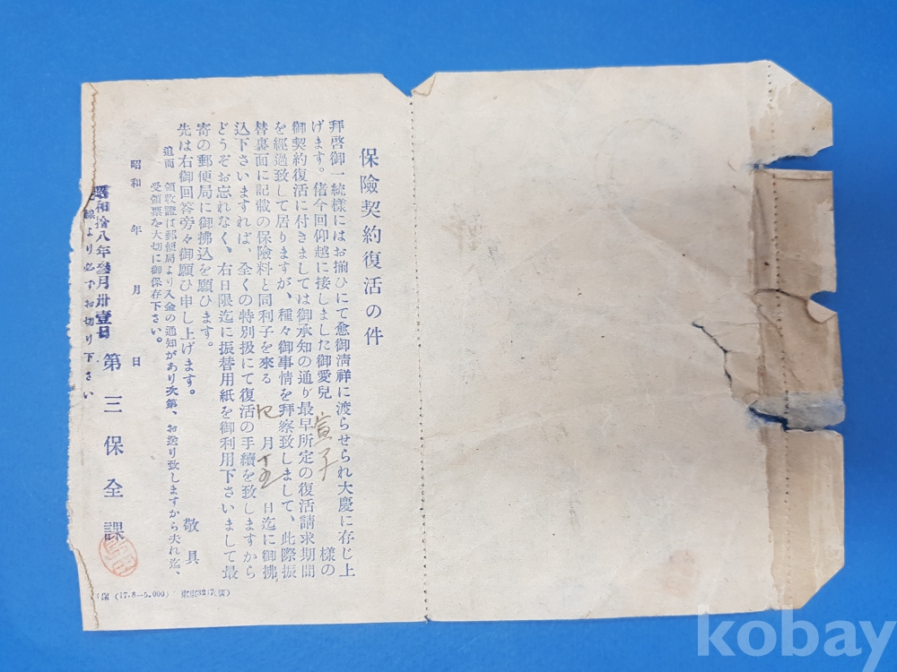 **** 1943년 부국징병보험상호회사 안내문 [보험계약부활의 건]