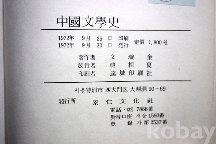 중국문학사 - 문선규 著 / 1972년. 경인문화사 발행