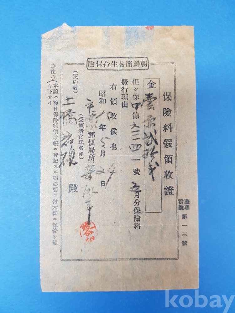 **** 1940년 조선간이생명보험 보험료영수증(평양우편국 수납)