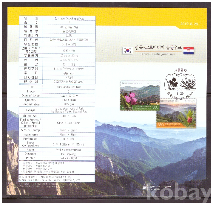 (안내카드) 2019.8.29 한국-크로아티아 공동우표 (접지않음)