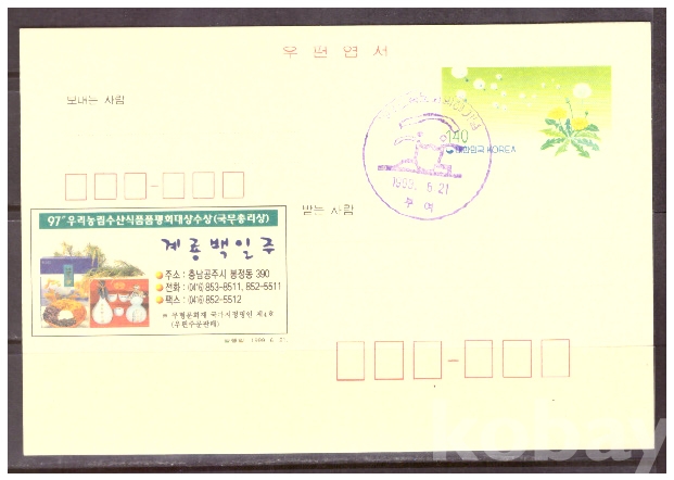 (광고엽서) 1999.6.21 지방판 LAPC 247 계룡백일주 (민들레 140원) (초일기념일부인)
