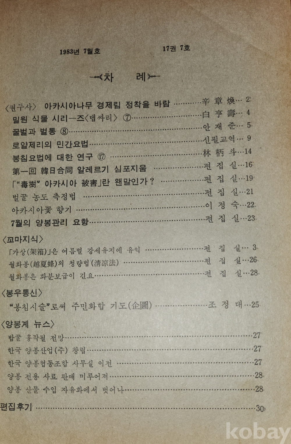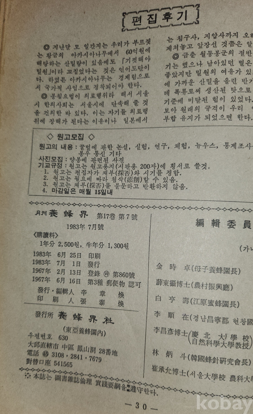 1983년에 발행된 양봉계(養蜂界) 양봉계사 발행7월호입니다,