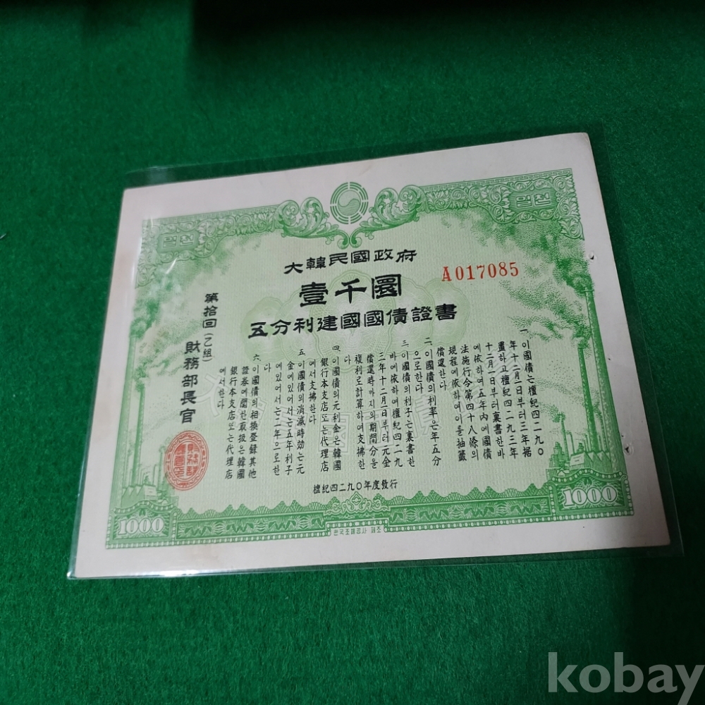 대한민국 1957년 건국채권 10회을1000환 사용제
