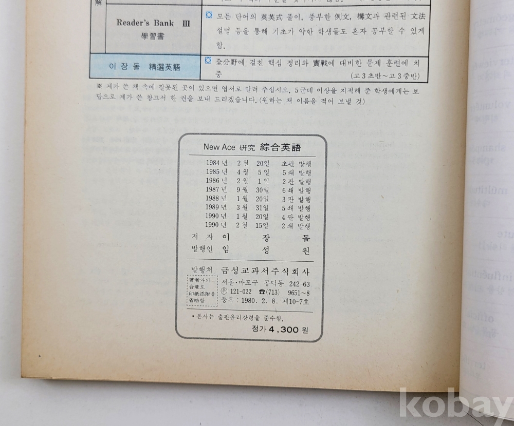 물 품 명 | NEW ACE : 이장돌 '종합영어' / 1990년 / 이장돌 / (주)금성교과서 |