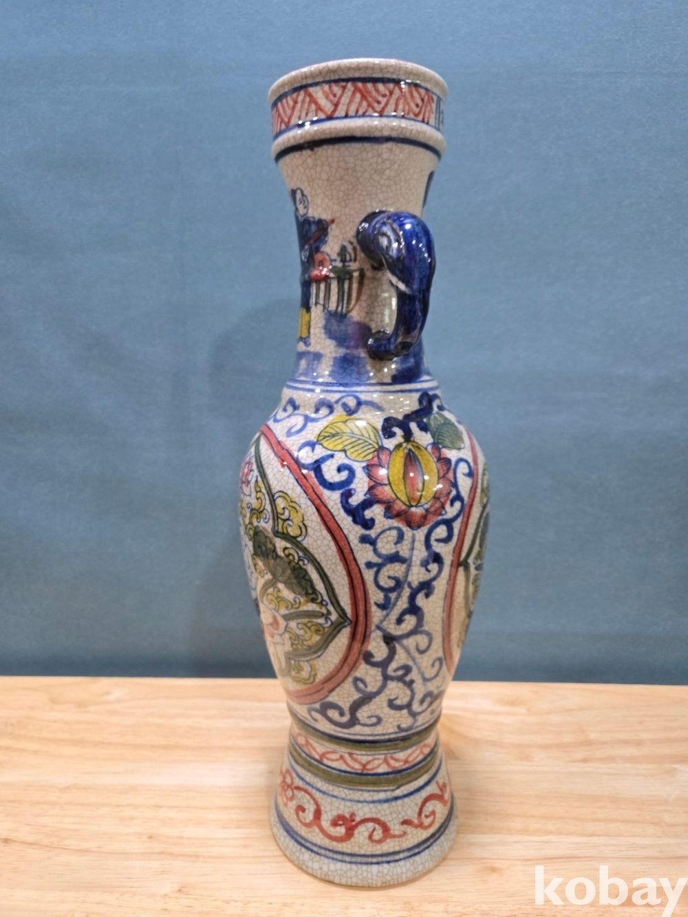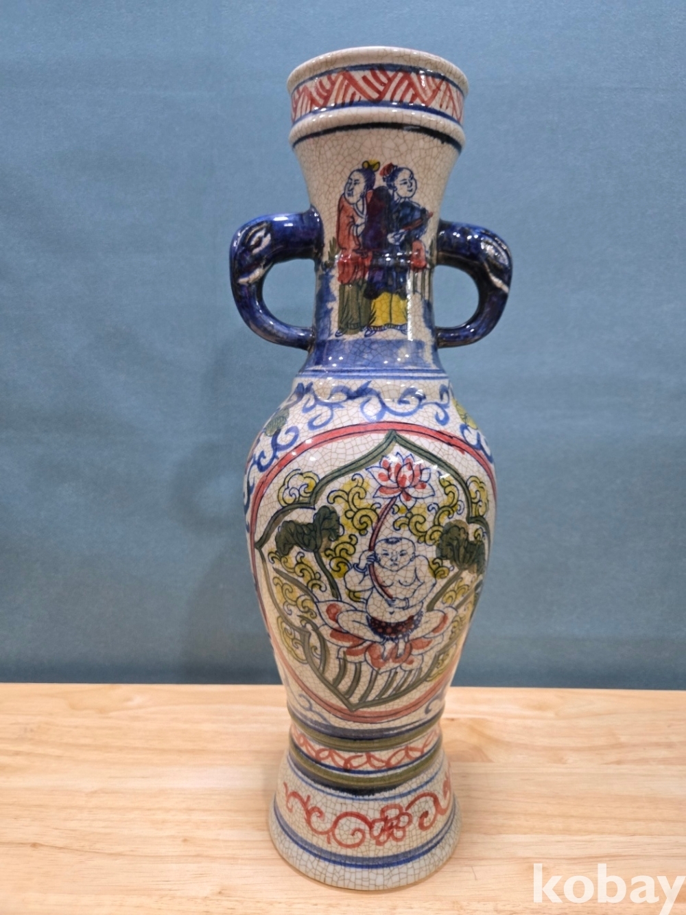 연꽃 위에 동자 표현 청화 도자기 입니다.
