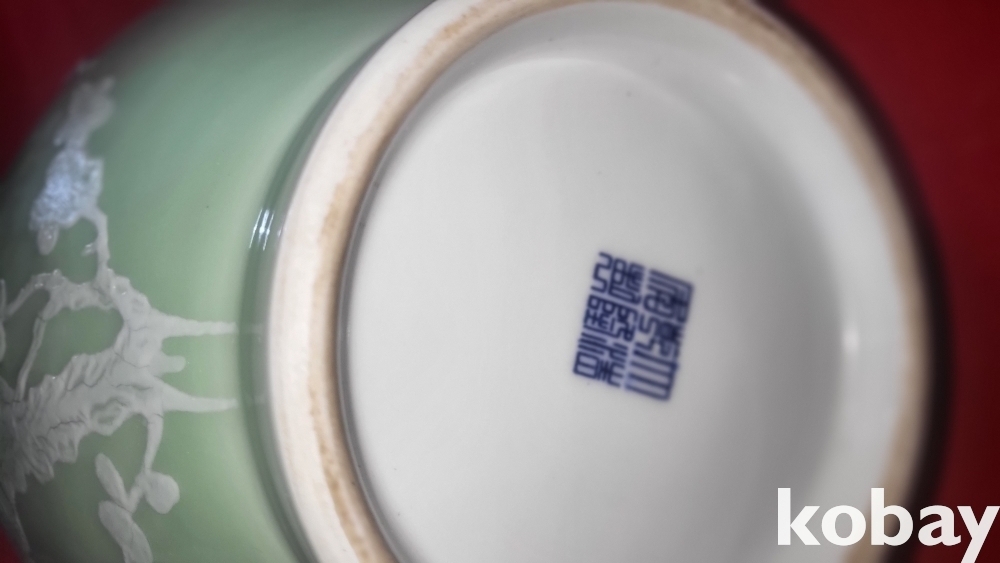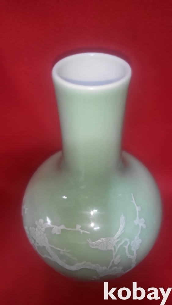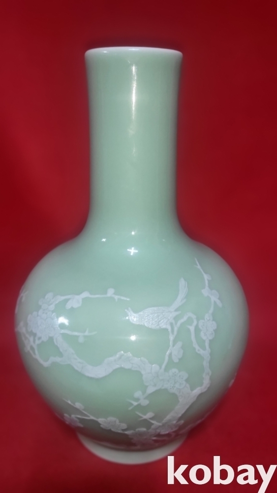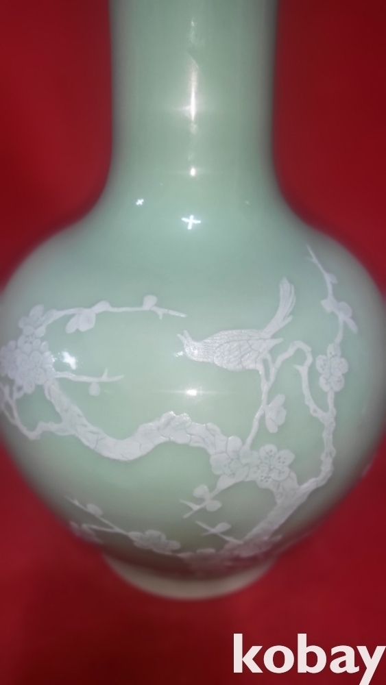 대청건륭 관지 보이는 청천(靑天) 색감에 매화와 박새문양 천구병입니다,