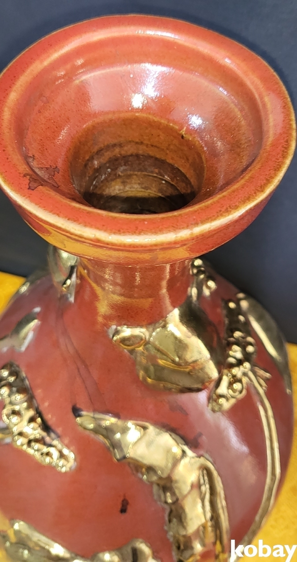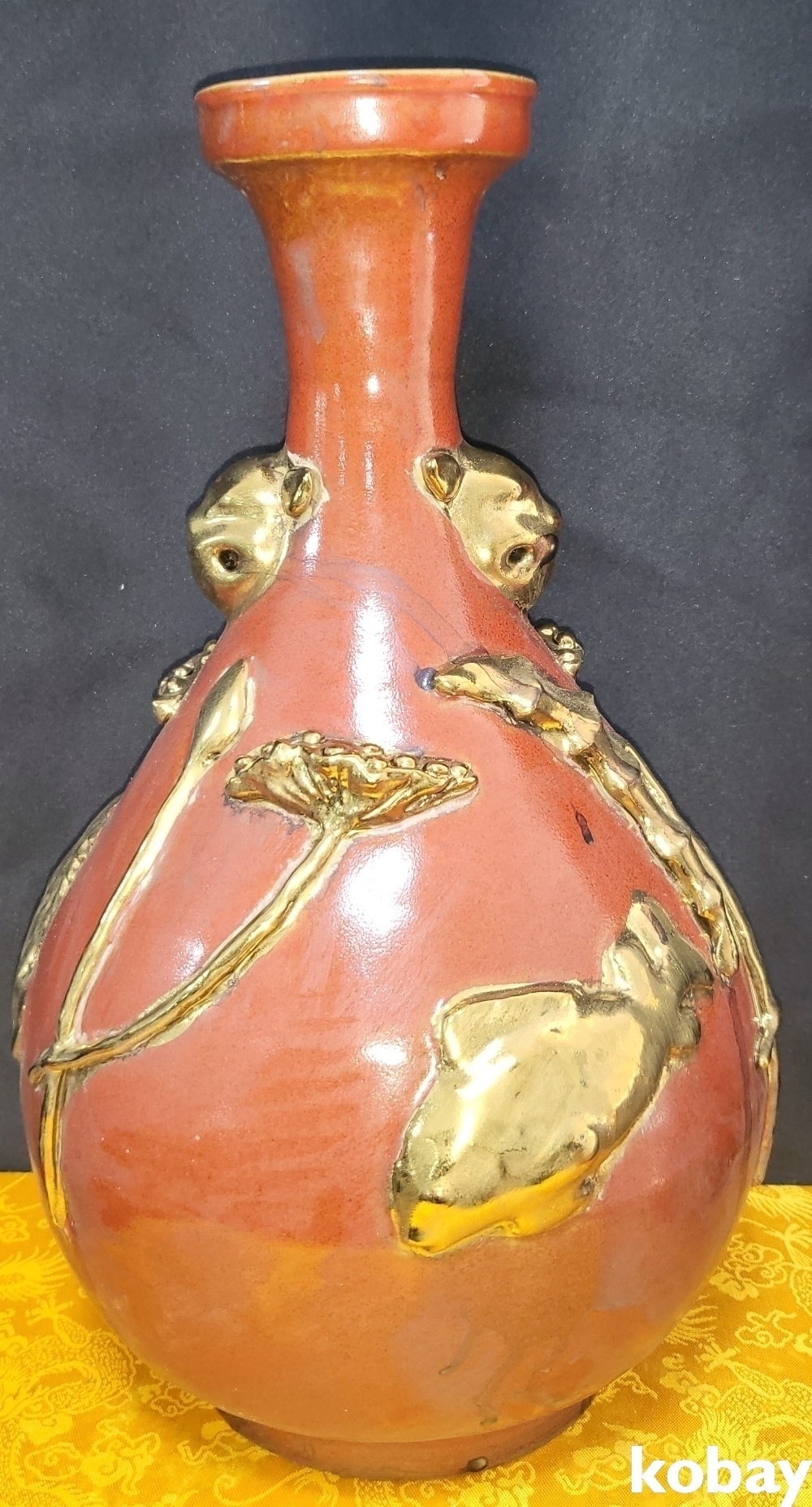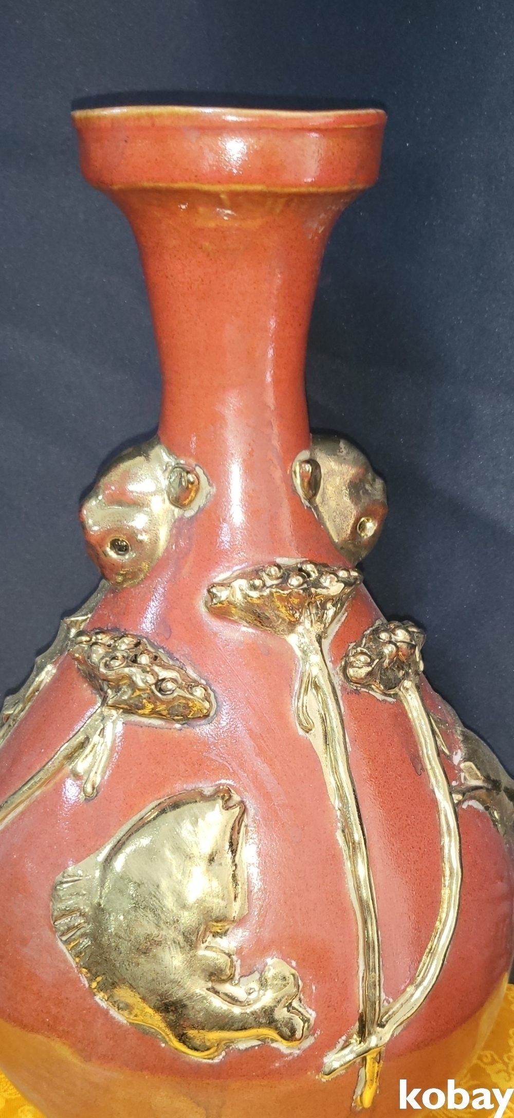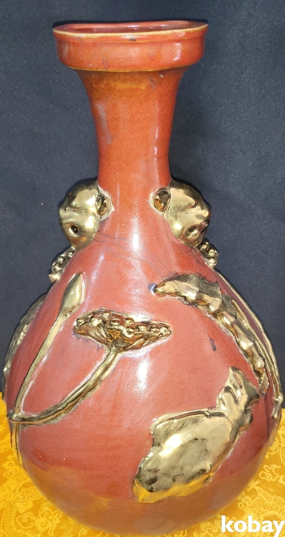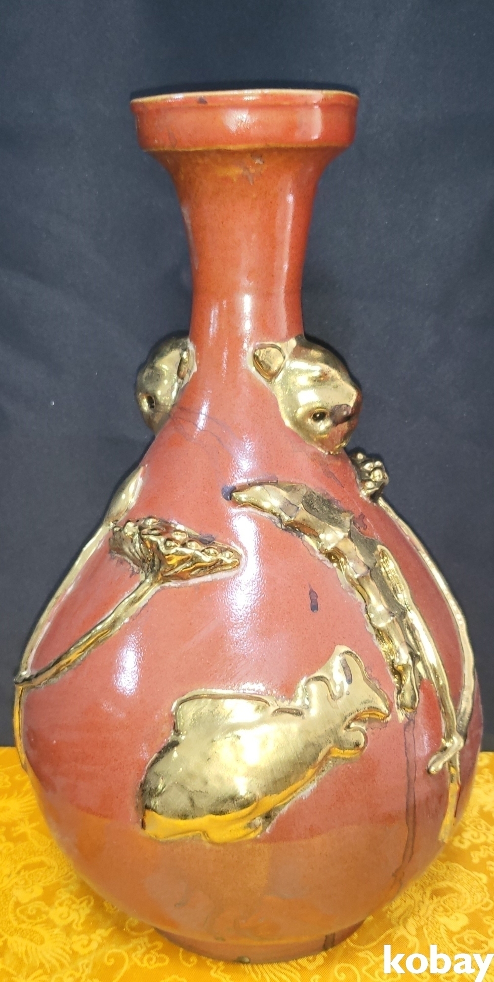 추부(樞府) 관지있는 홍유(紅釉) 금채 첩화(貼花) 연꽃과 물고기 문양 광구병입니다,