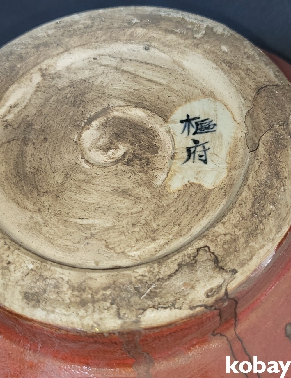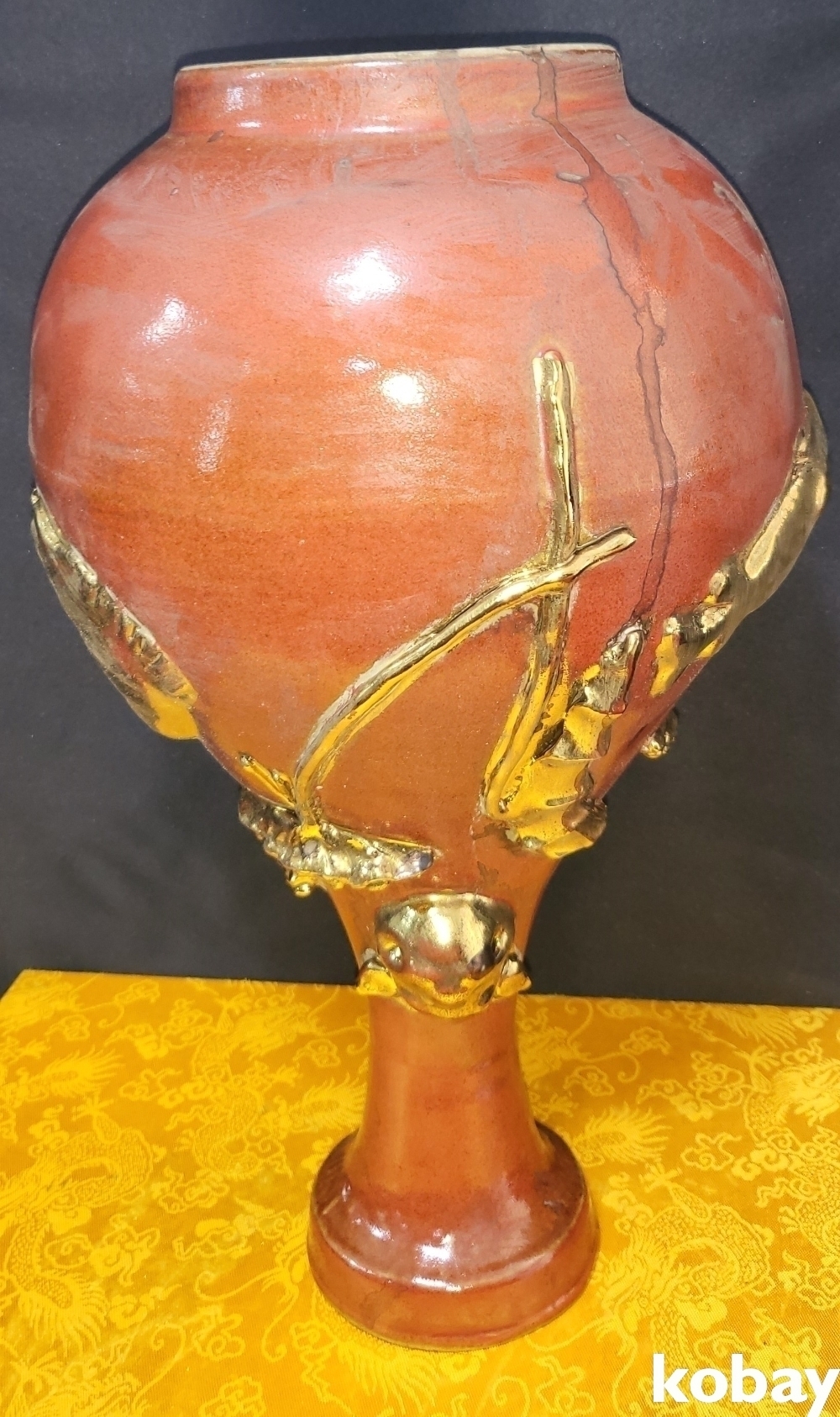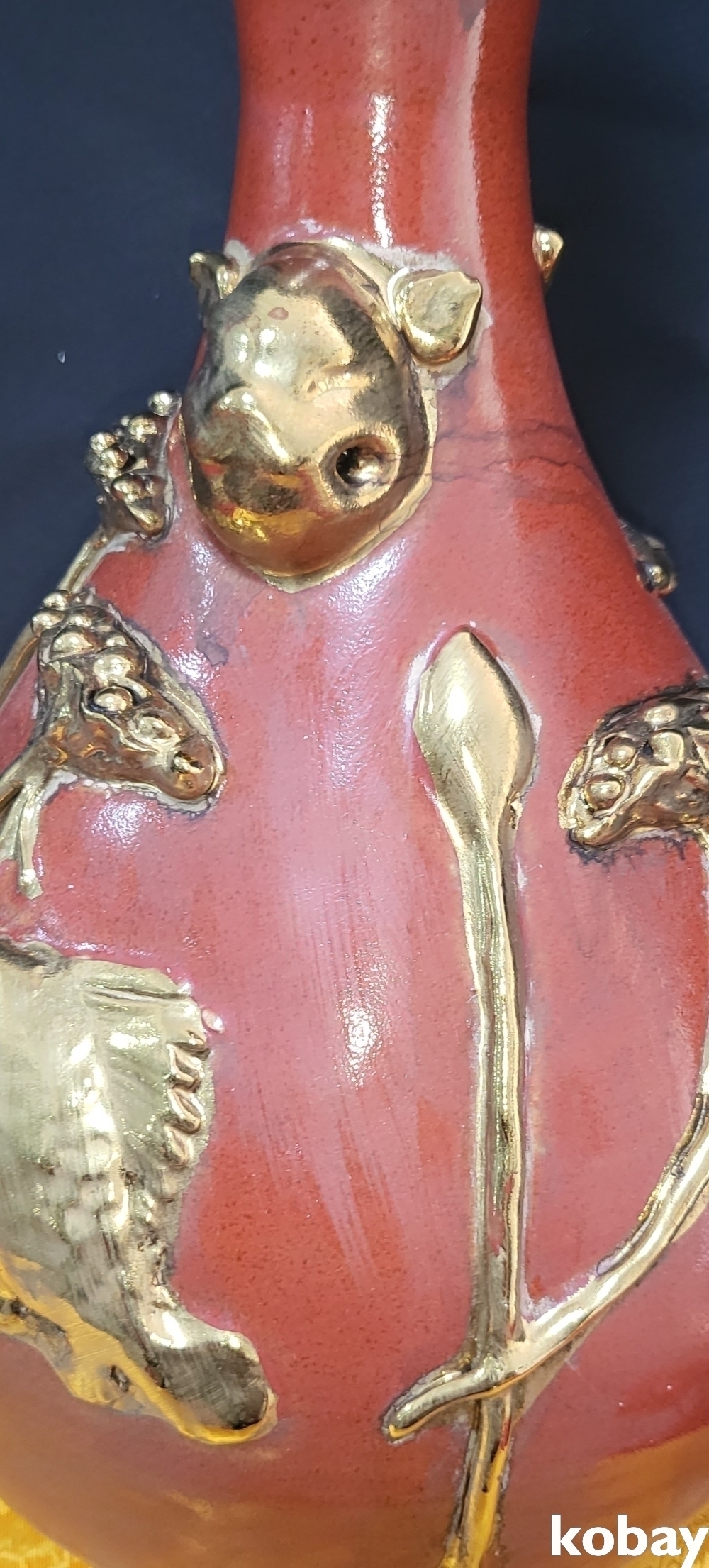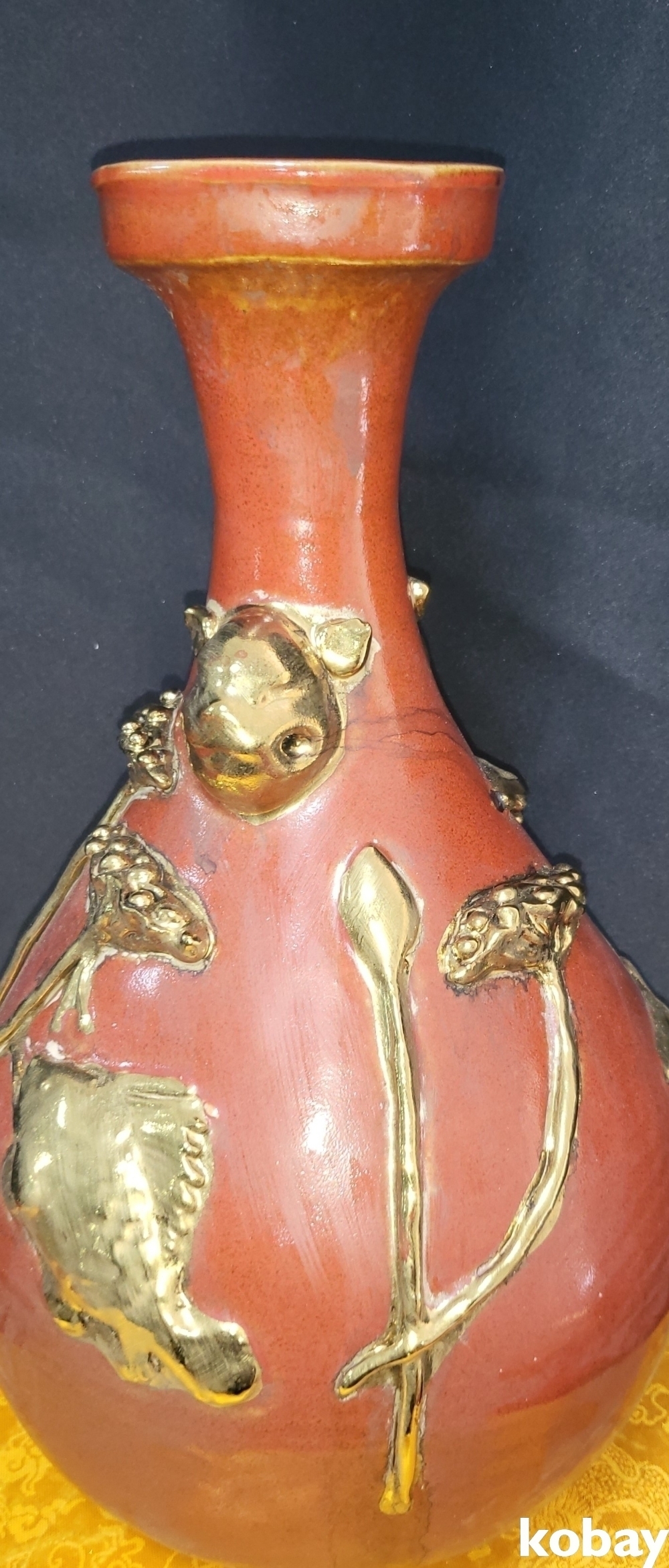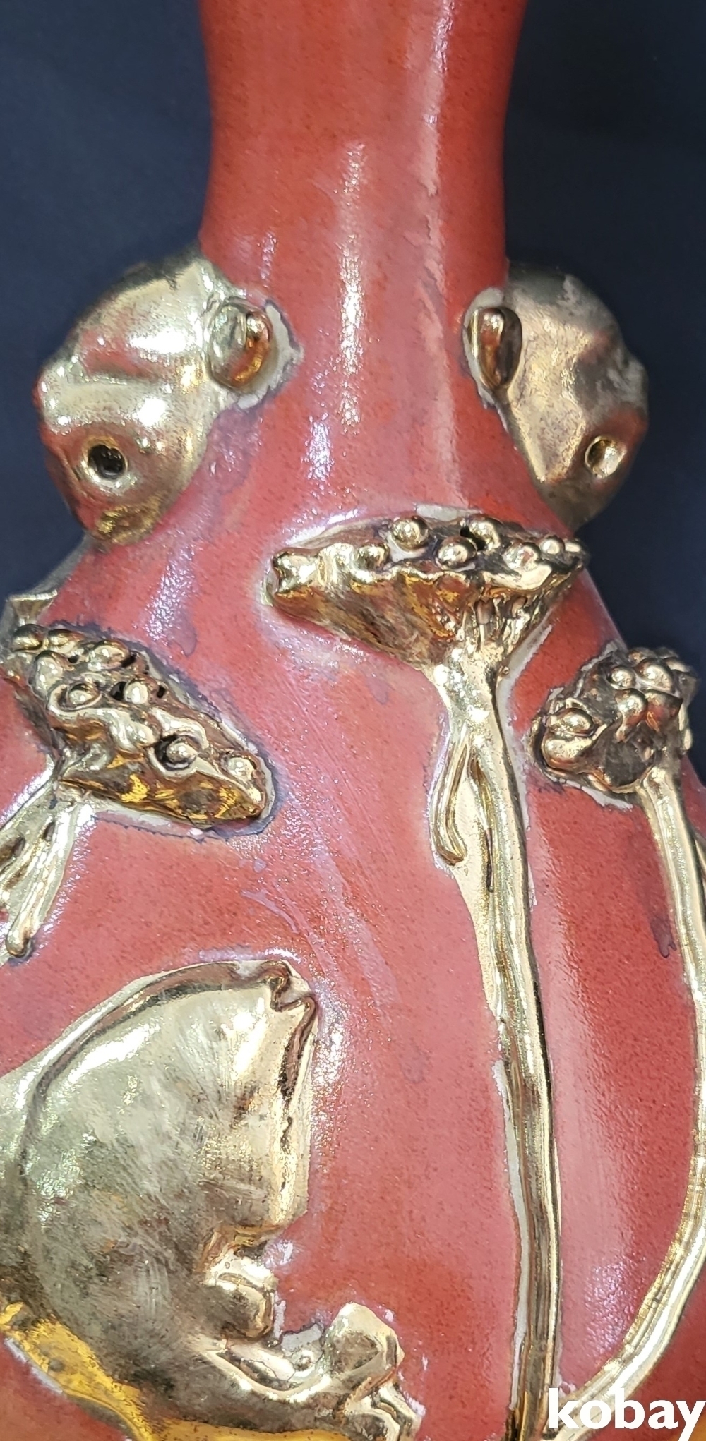추부(樞府) 관지있는 홍유(紅釉) 금채 첩화(貼花) 연꽃과 물고기 문양 광구병입니다,