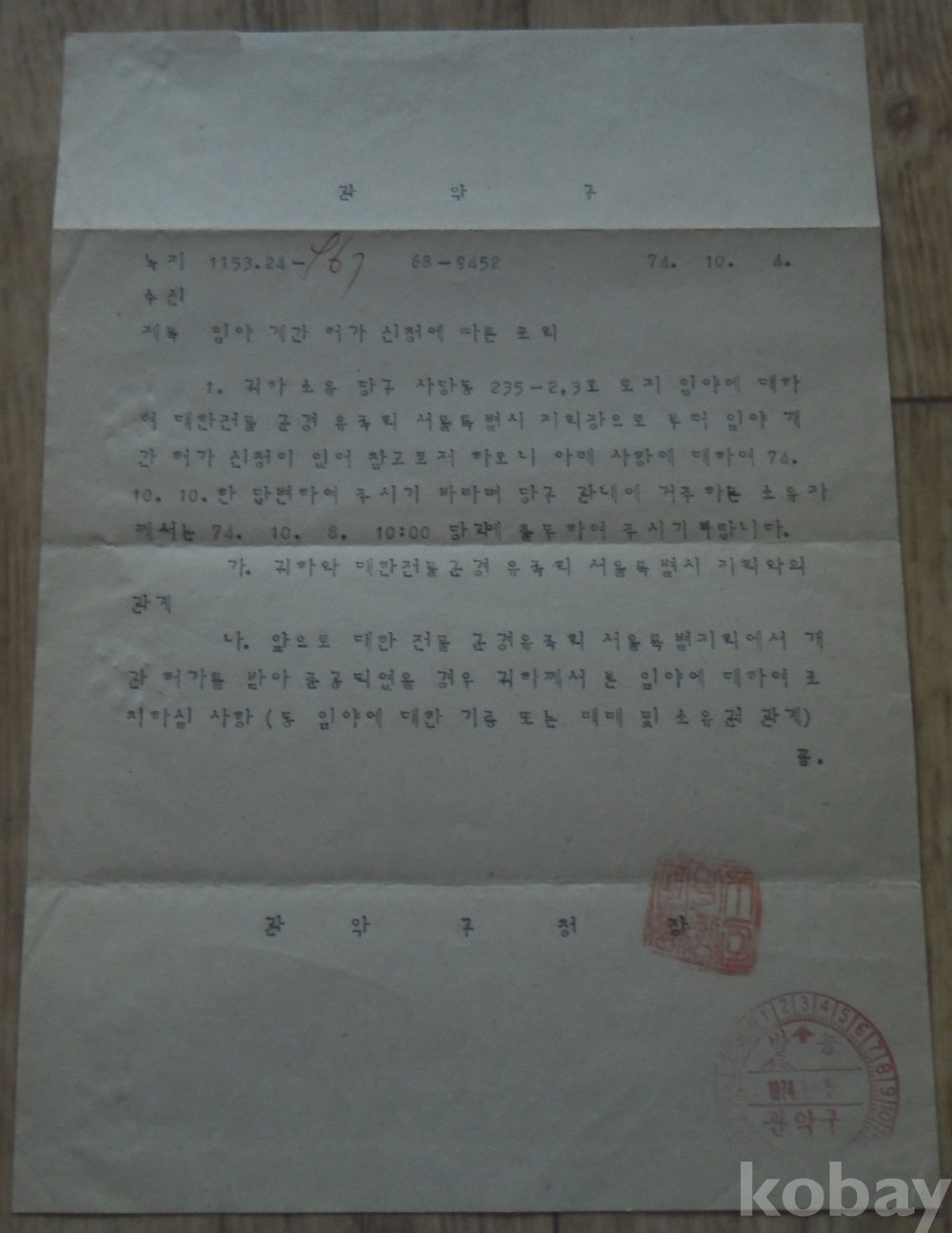 1974년 임야개간허가신청에 따른 조회서(관악구)