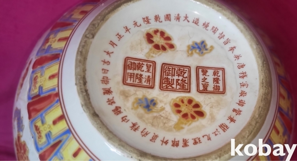 굽에는 3개의 사각 관지와 대청국 건륭 원년 정월대길일 등의 글이 홍채로 쓰여진 기물입니다,