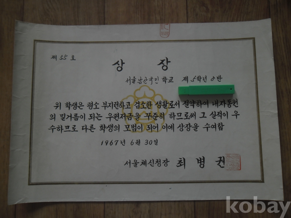 1967년 서울체신청장 상장