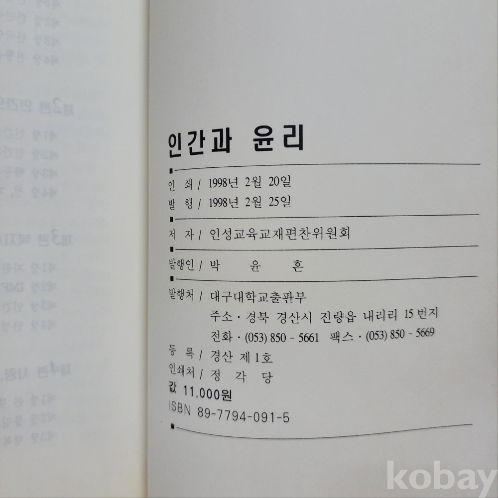 [천원경매] 인간과 윤리 ; 대국대학교 출판부 1998년 초판본