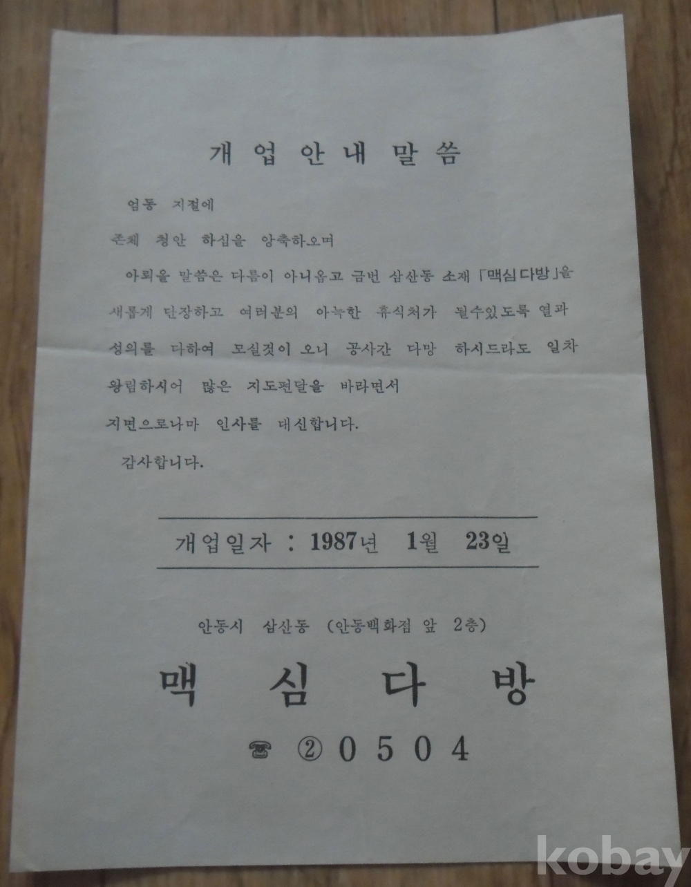 옛 전단지: 1987년 맥심다방 개업안내(안동)