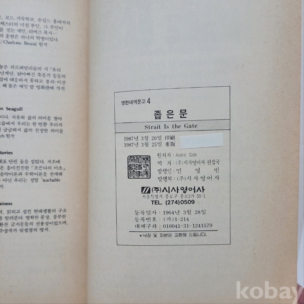 [천원경매] 좁은문 시사영어사 (1987년) / 문고판