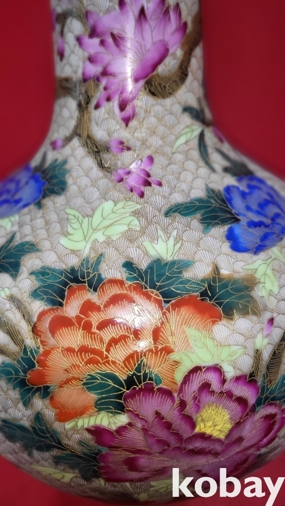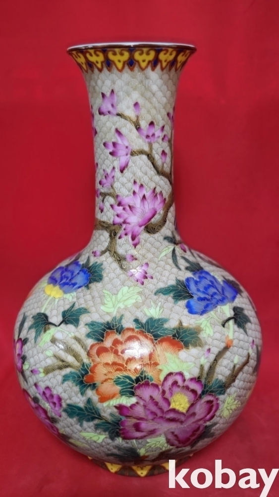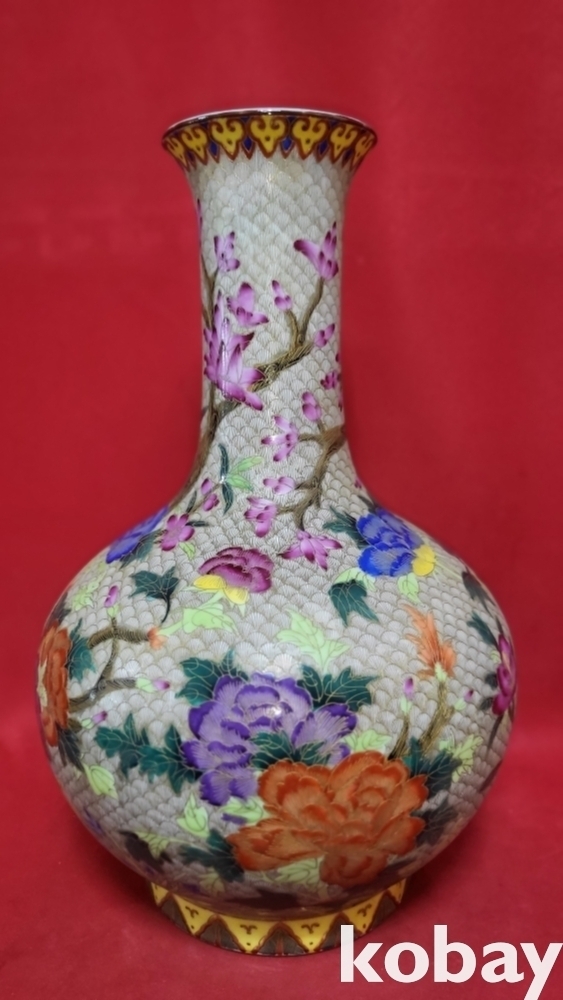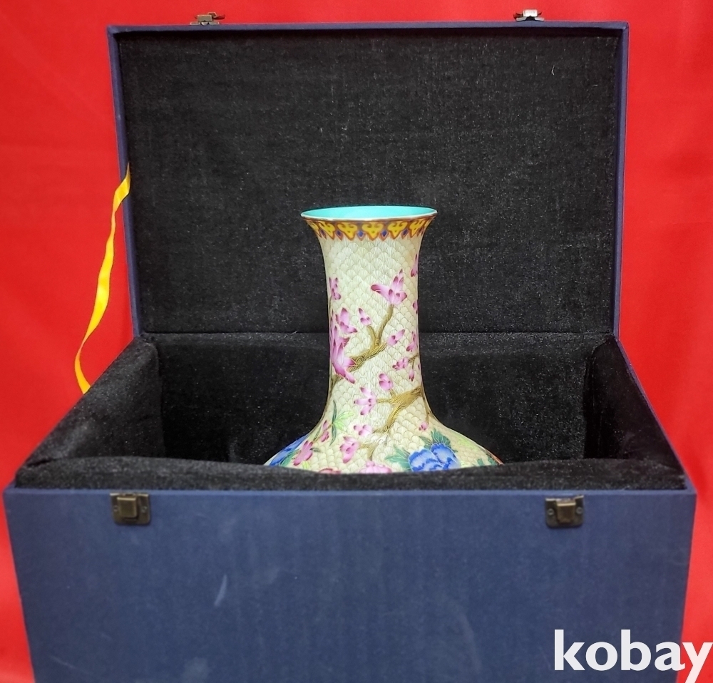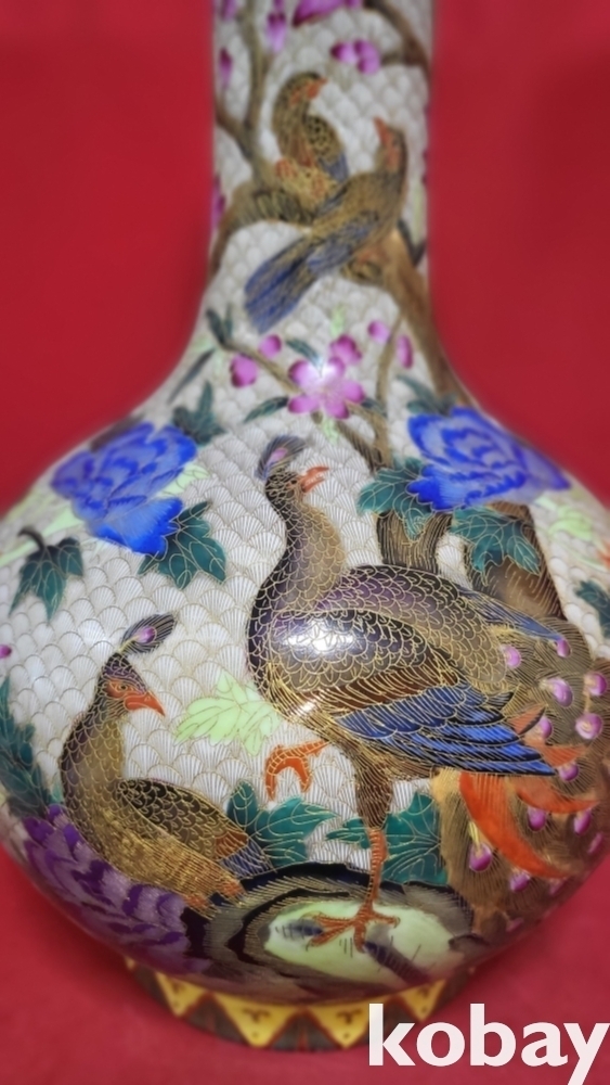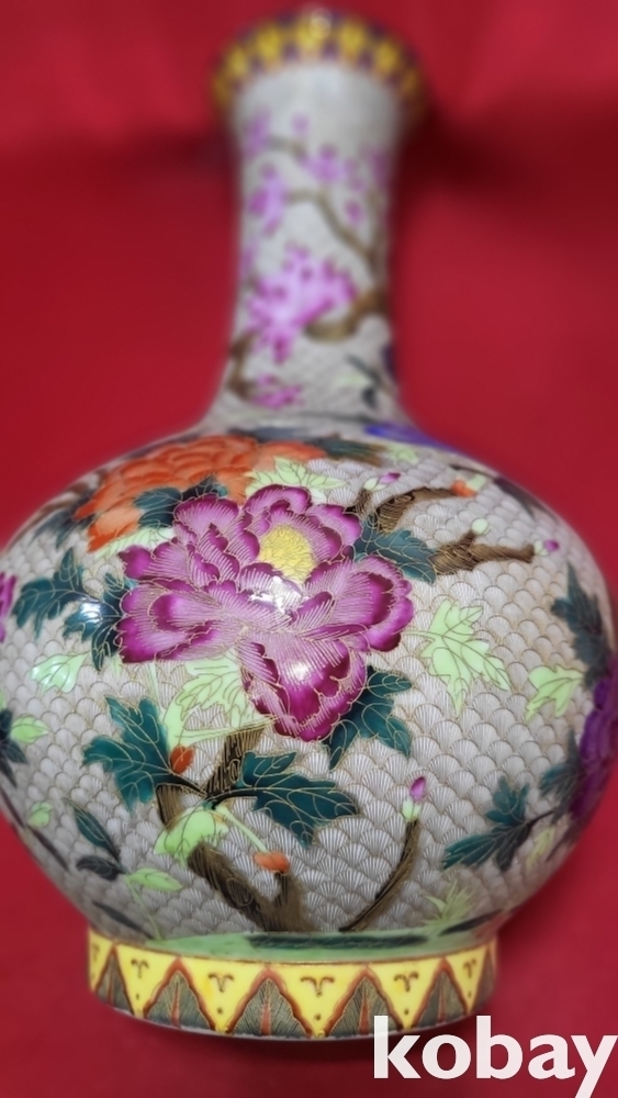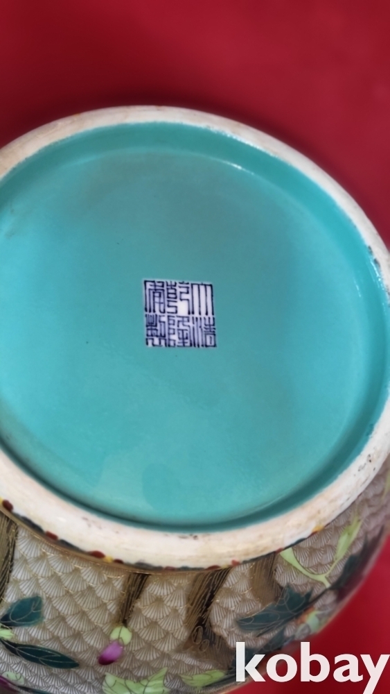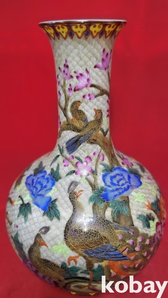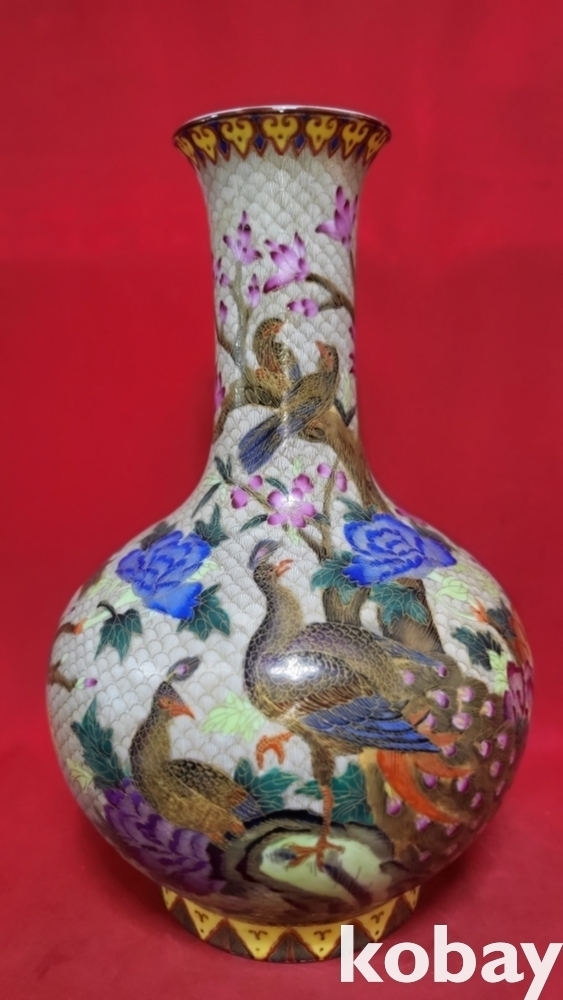 대청건륭연제 관지 보이는 각화전금 기법으로 안성된 금채 화조(花鳥)문양 천구병(天球瓶)입니다 천구병(天球瓶) 은 황제가 쓰던 그릇에 붙이던 이름이었다고 합니다.