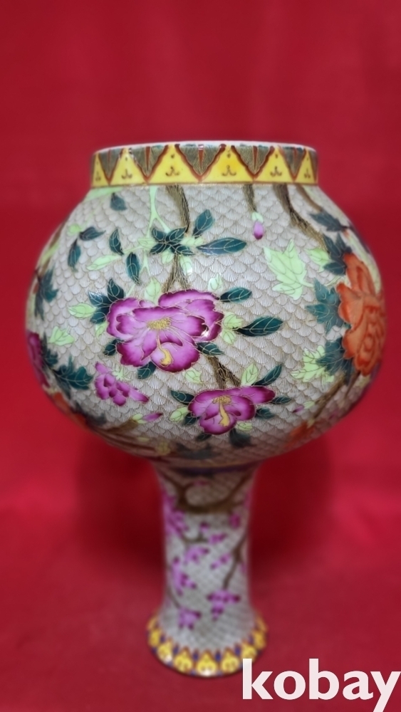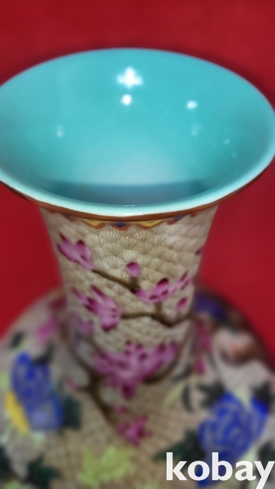 각화전금이란 도자기 전체를 금으로 둘러싼 후 그 위에 색상에 맞추어 각종 천연 보석 가루로 다양한 무늬의 그림을 그리고서 또 다시 일일히 그림마다 날카로운 죽도(竹刀)로 그림의 윤각을 파내어 입체감을 표현하여 완성 시키는 최고난이도를 지닌 도자기입니다,