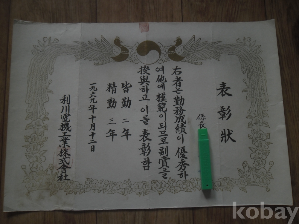 1969년 이천전기공업주식회사 표창장