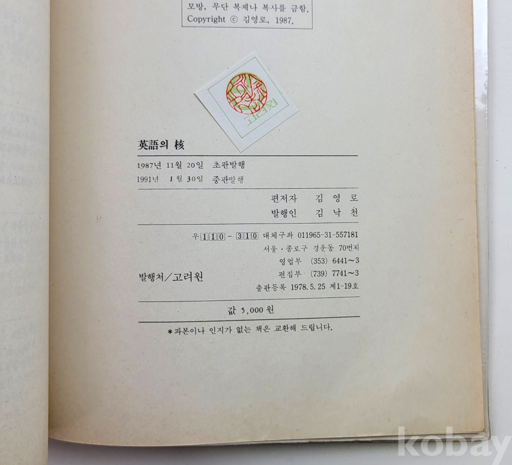 물 품 명 | 영어의 핵 / 1991년 / 김영로 / 고려원 |