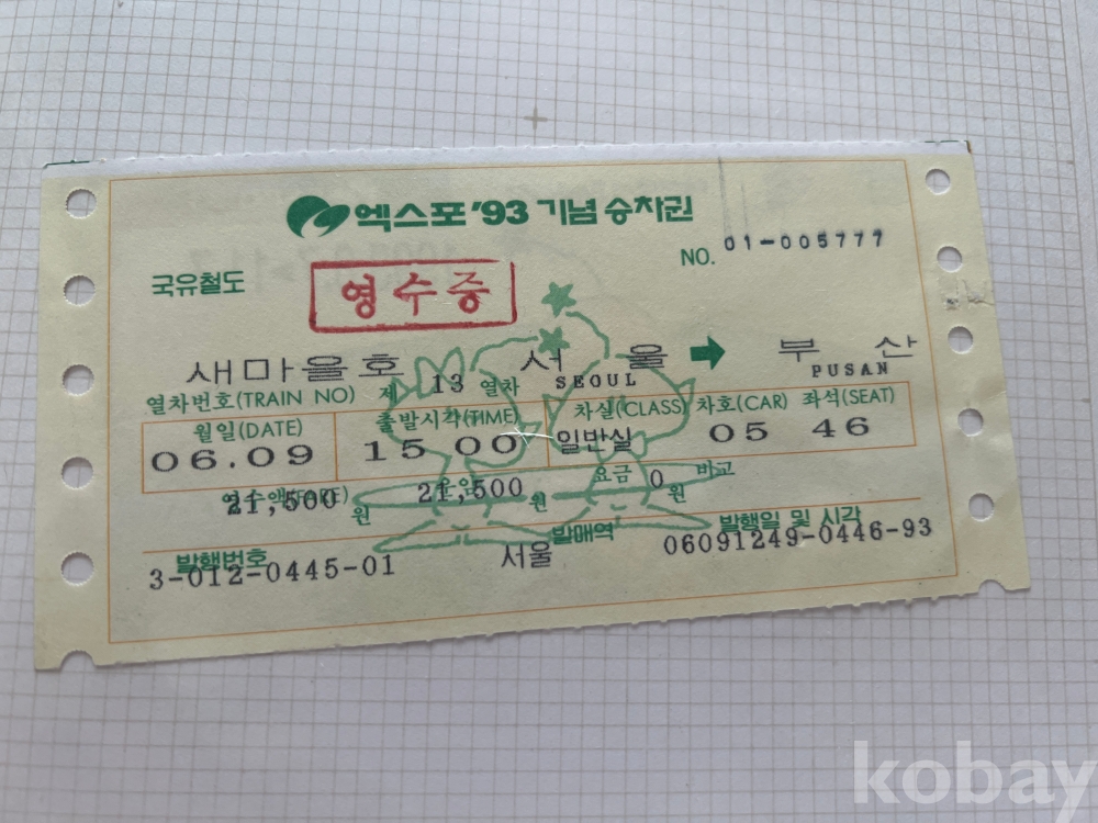 [고전] 희귀 1993 엑스포 기념 승차권 국유철도 영수증 새마을호