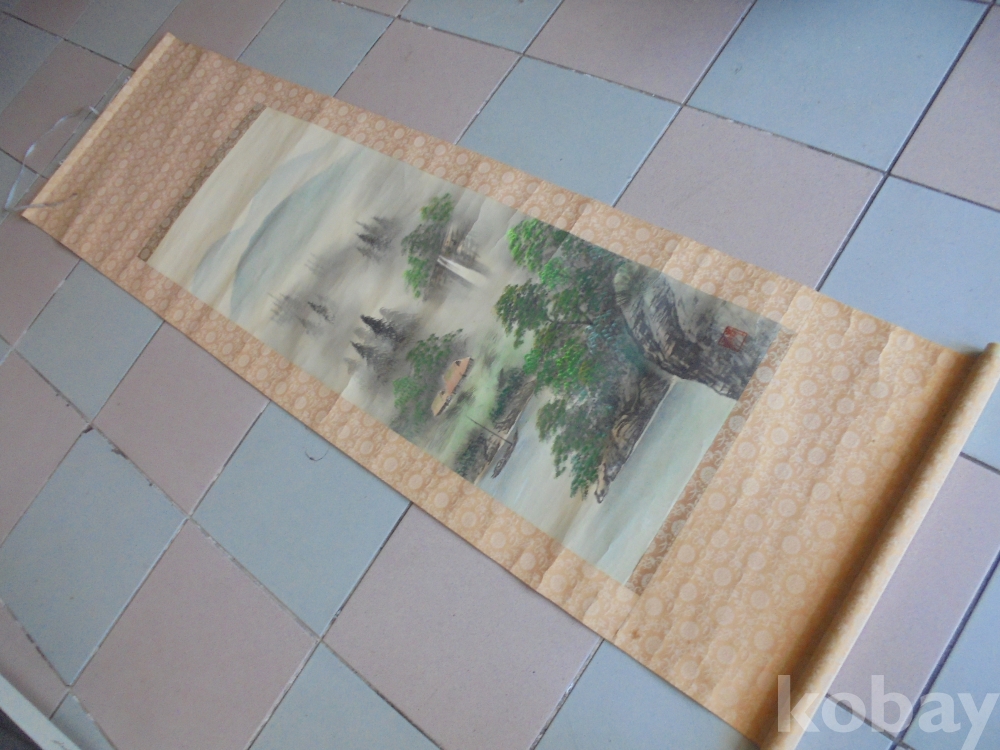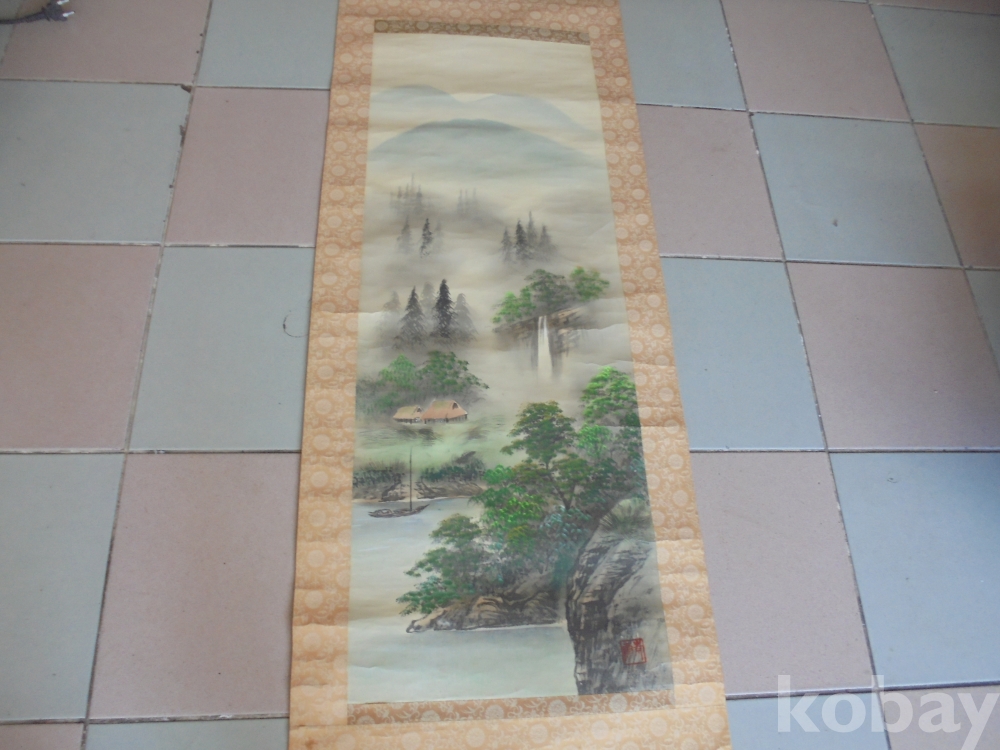 오래되여 더욱 그윽하게 보이는 소리나는폭포가 보이고 집과 배 원근처리가 잘돤 영적인 산수풍경화 족자