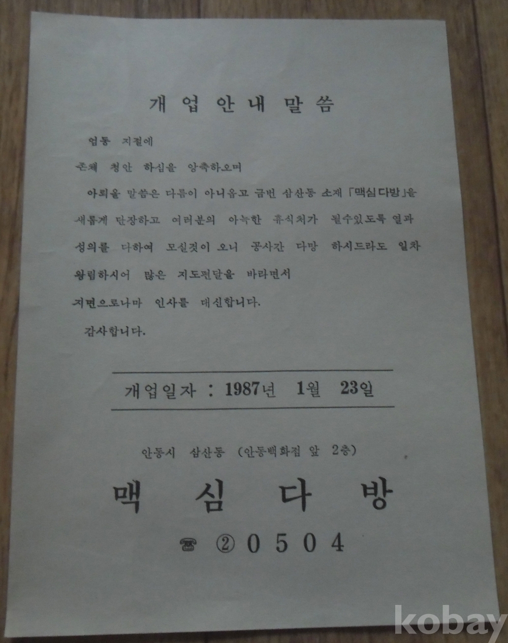 옛 전단지: 1987년 맥심다방 개업안내(안동)