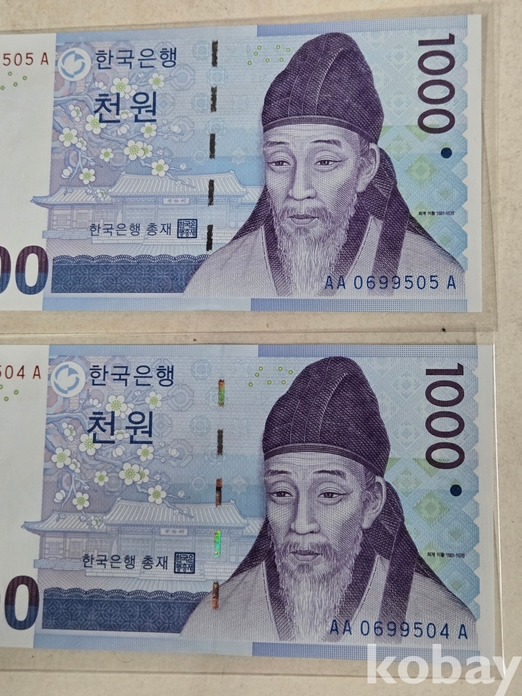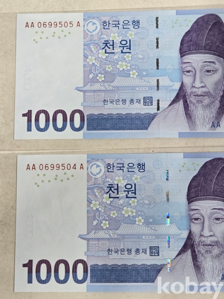 AAA 06포인트== 한국은행 천원권 초판 기호 AAA 06포인트 이어지는 연번호 2매 일괄 = 완전미사용
