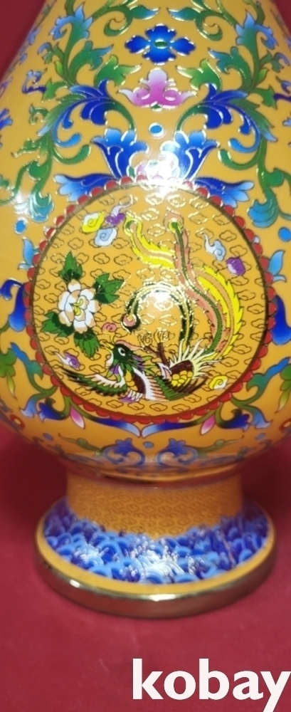 건륭어제 관지 보이는 황지 바닥에 범랑채 화훼와 개광 용봉문양 광구병입니다,