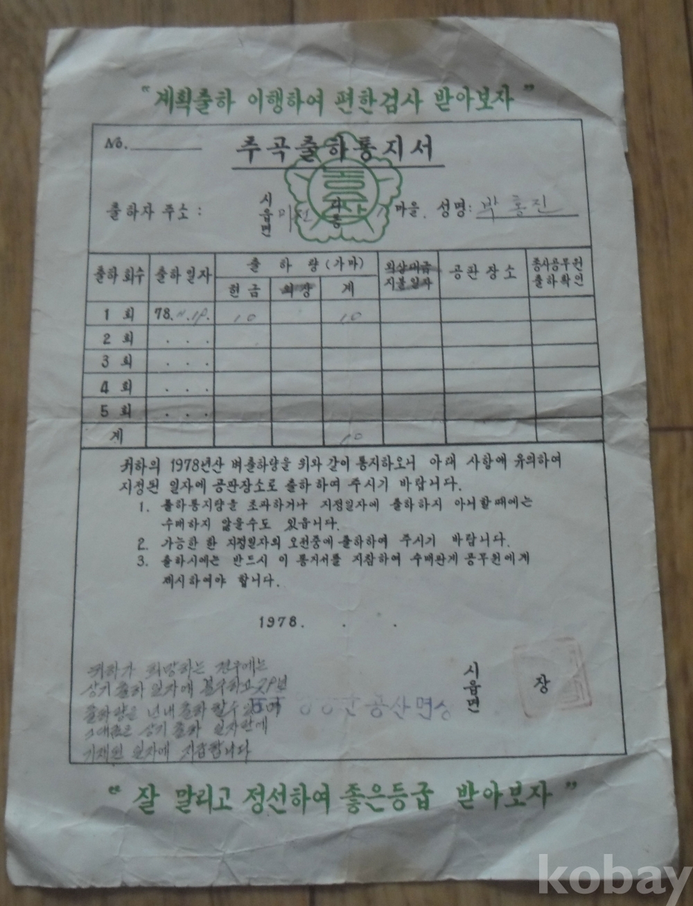 1978년 추곡출하통지서(영동군)