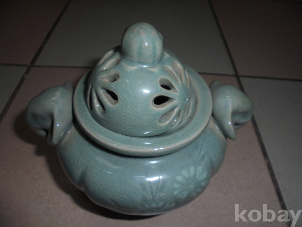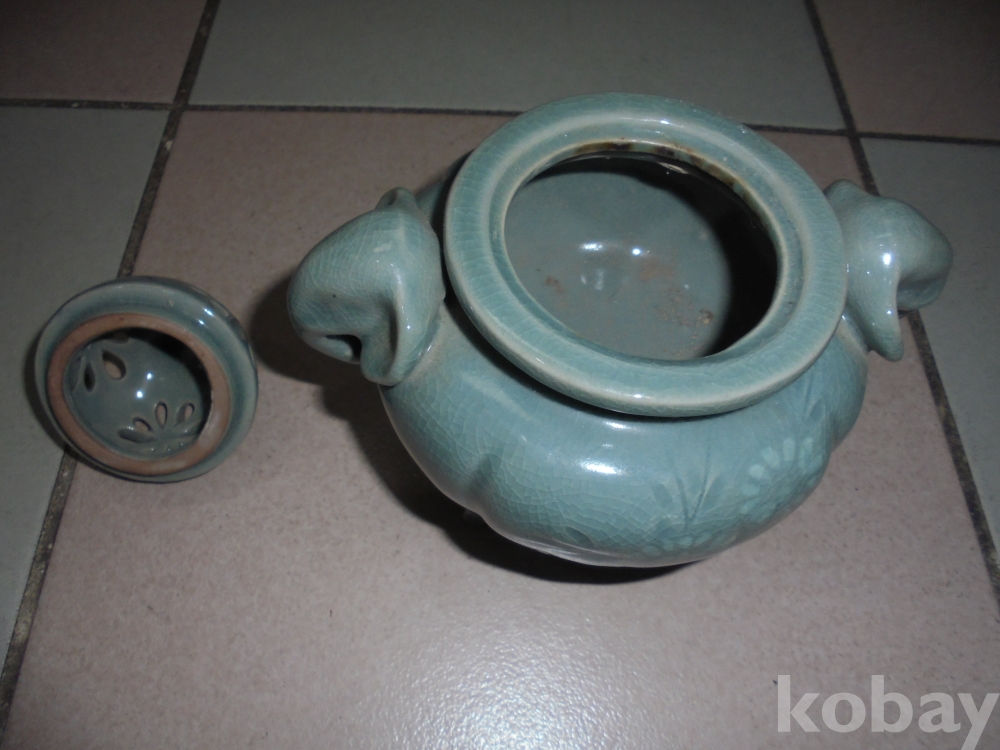 고운 연청자 몸통에 흰국화줄기와 꽃무늬 코키리손잡이 투각국화무늬의 손잡이투껑 열처리한 예술적인 여당 연청자 향로