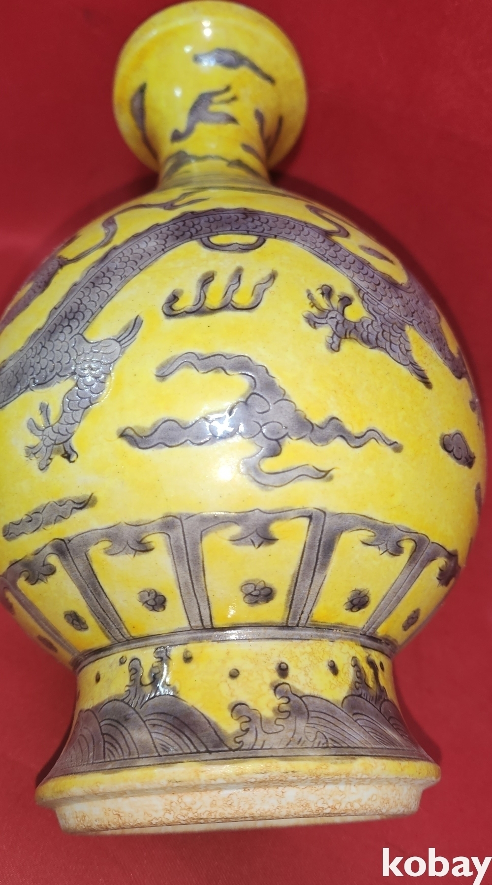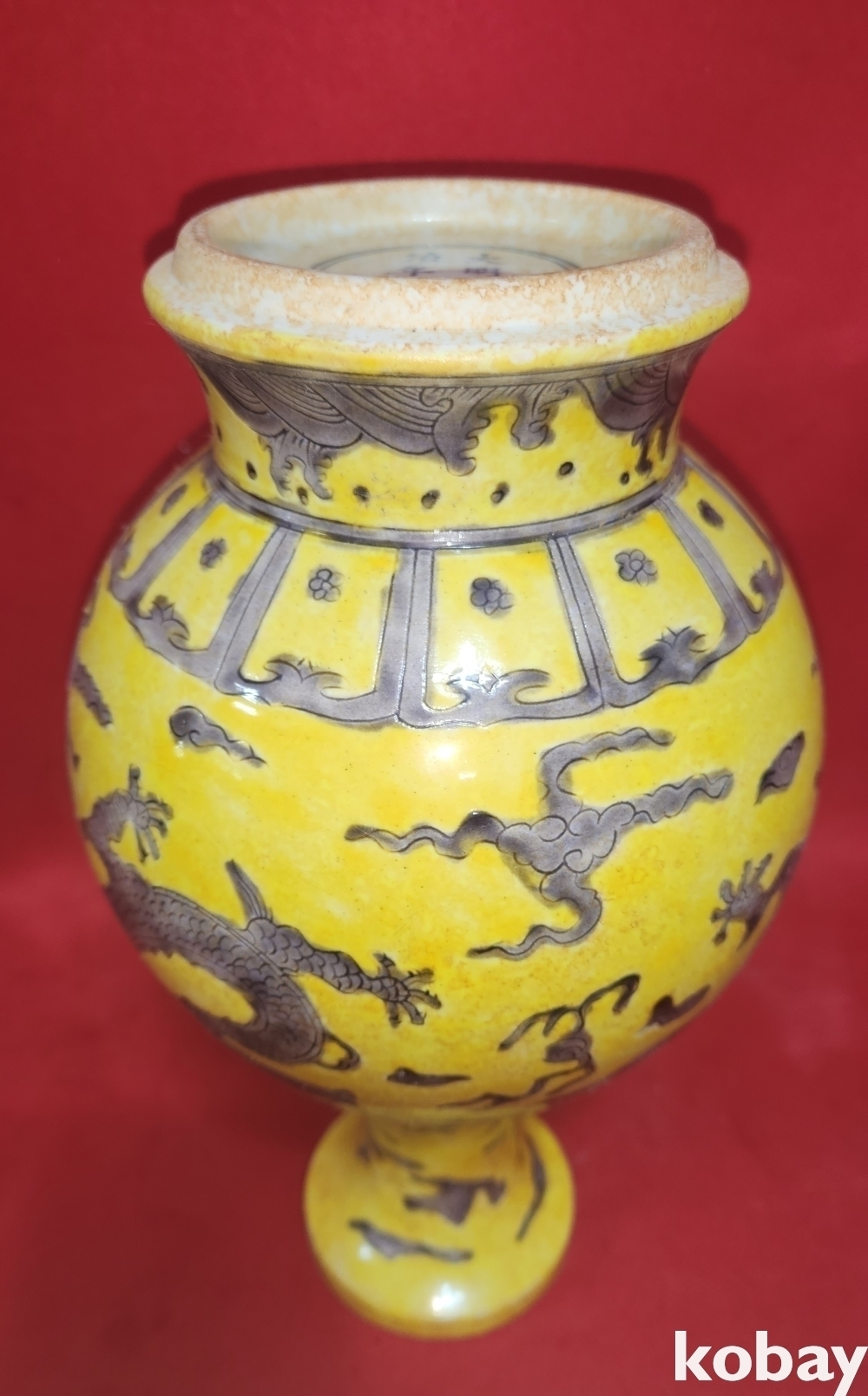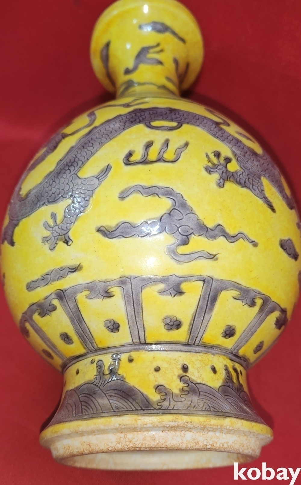 대명홍치연제 관지 있는 황유(黃釉) 쌍용문양 천구병입니다,