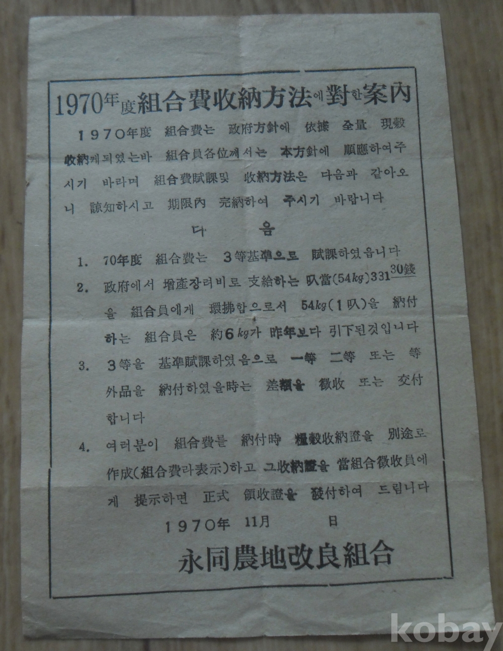 1970년 영동농지개량조합 조합비수납방법 안내