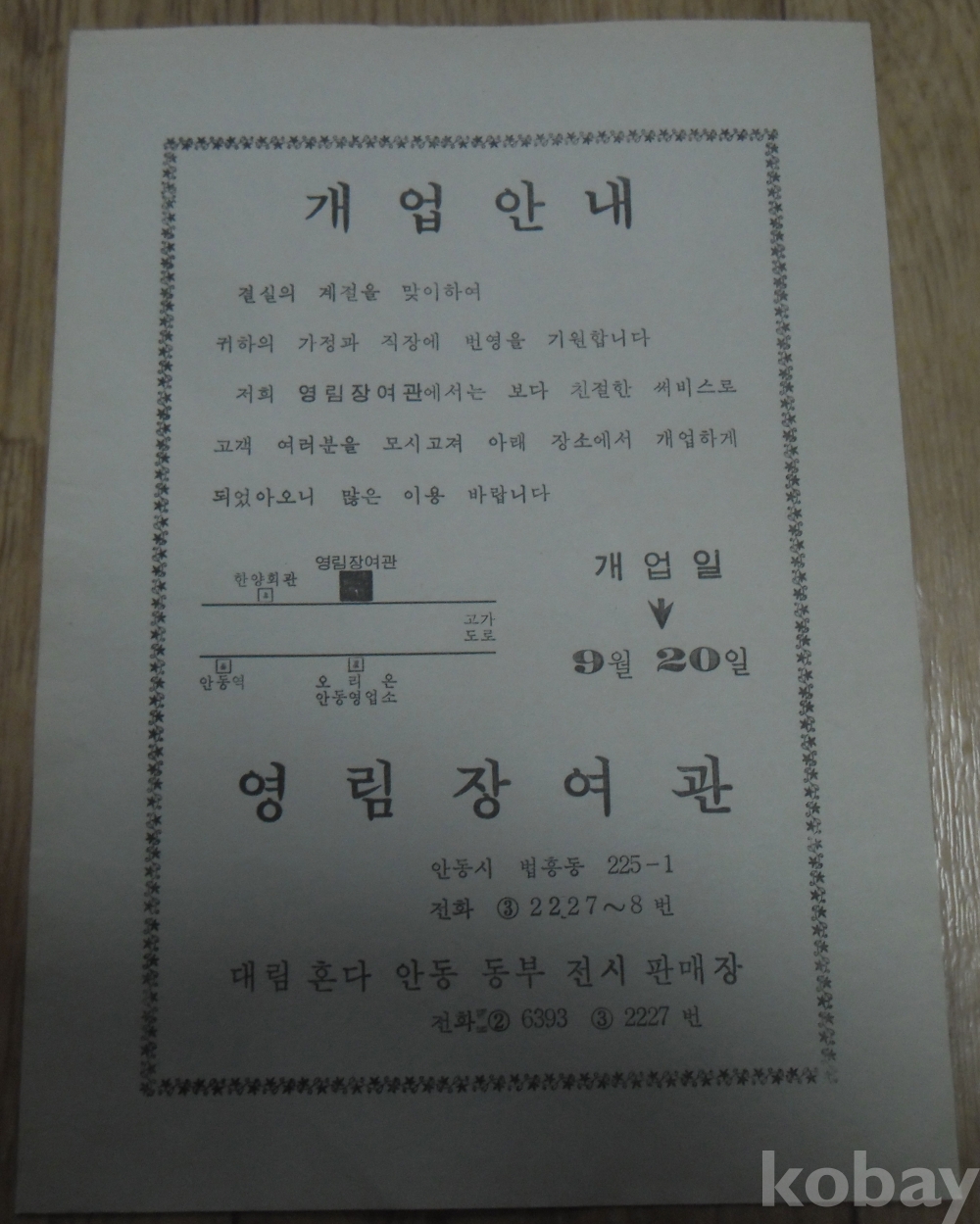 옛 전단지: 영림장여관 개업안내(안동)
