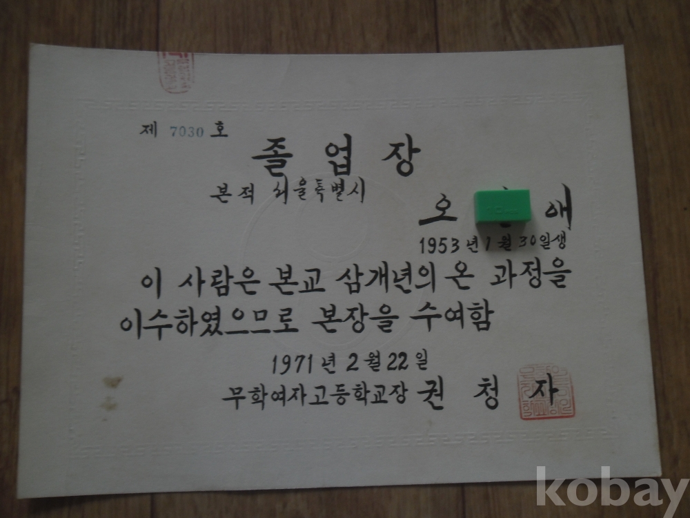 1971년 무학여자고등학교 졸업장