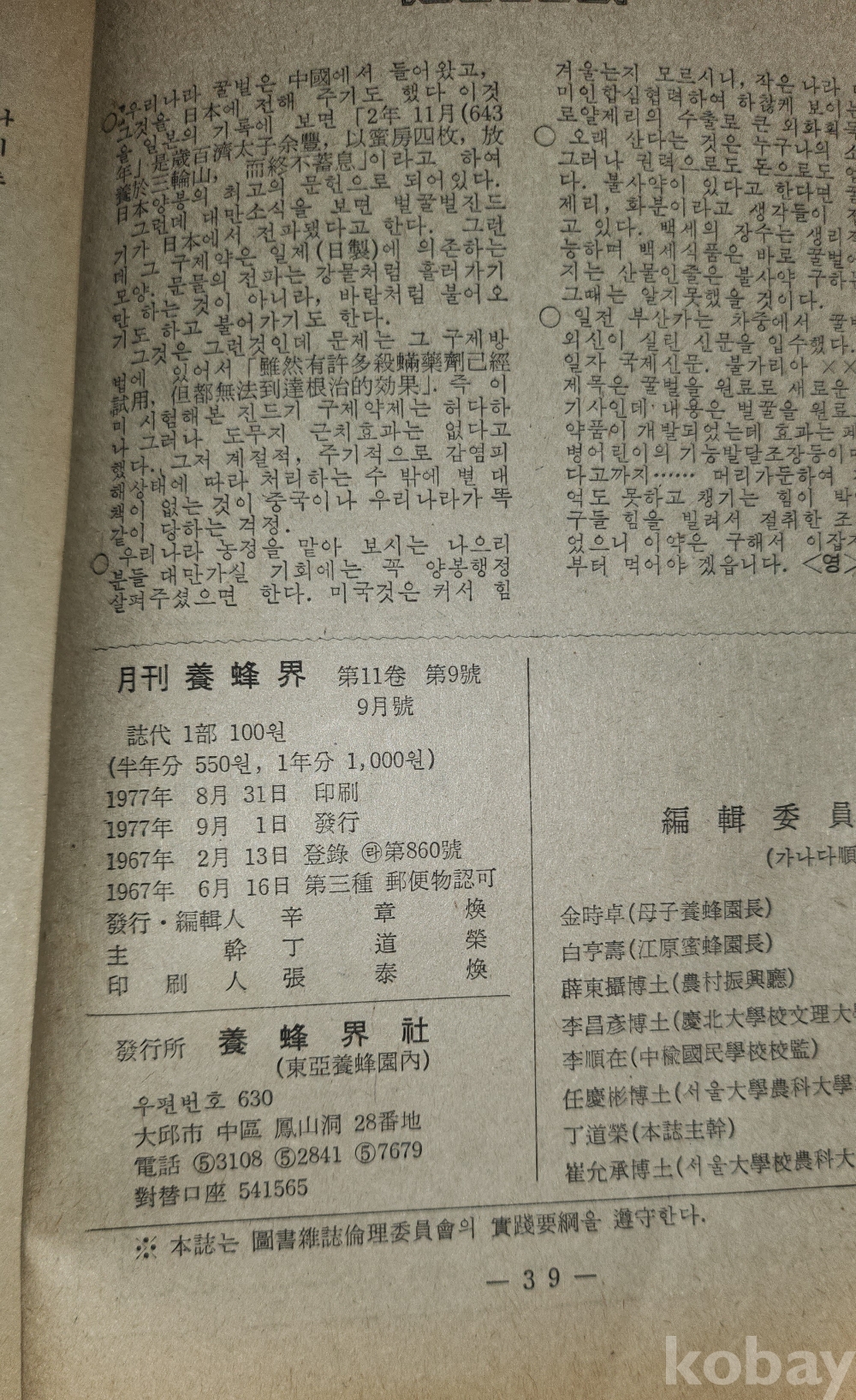 1977년에 발행된 양봉계(養蜂界) 양봉계사 발행9 월호입니다,