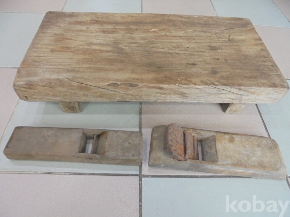 오래된때물이좋은 소나무 다리달린 두터운 큰도마와 대패날이 있는것과 없는 오래되고 깨끗한 중간형 대패 2점