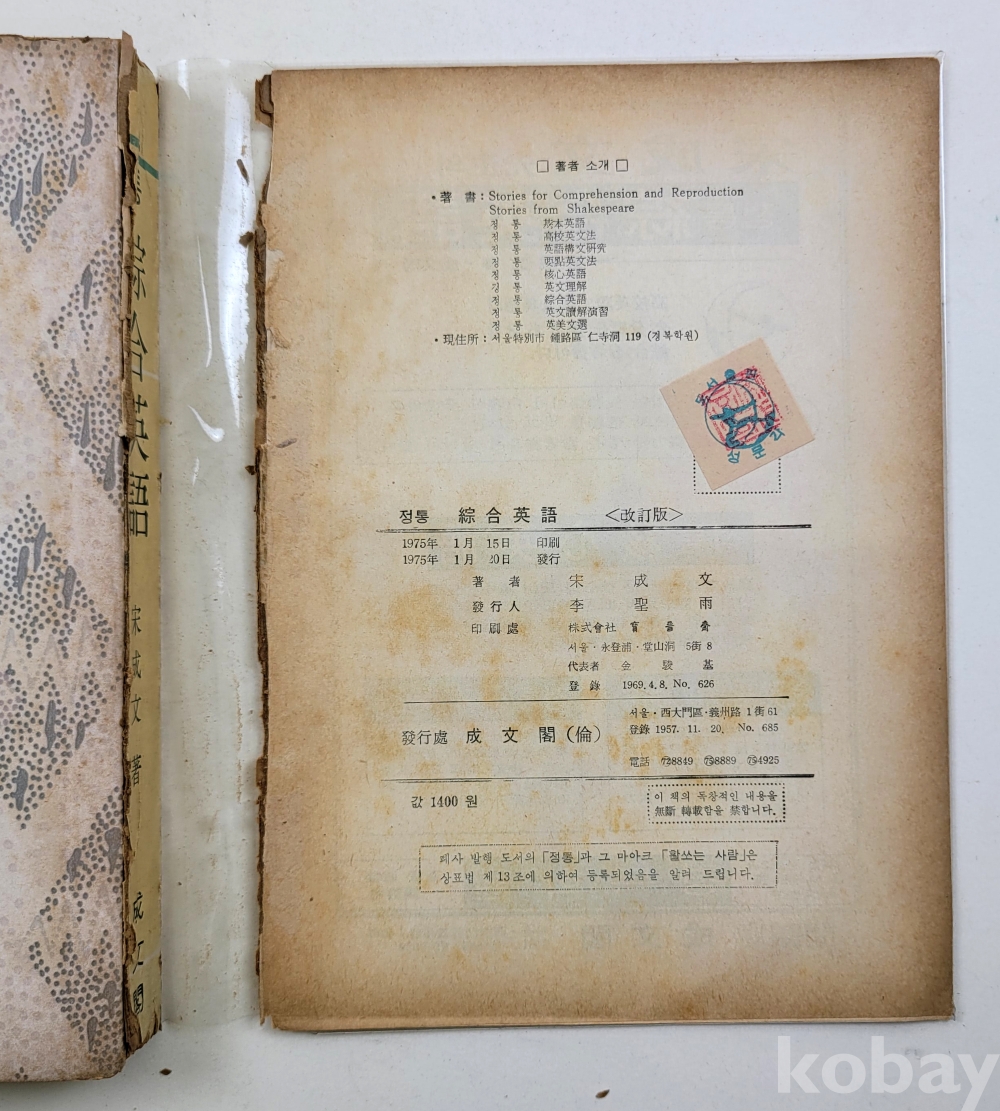 물 품 명 | 정통 종합영어 / 1975년 초판 : '75 개정판 / 송성문 / 성문각 |