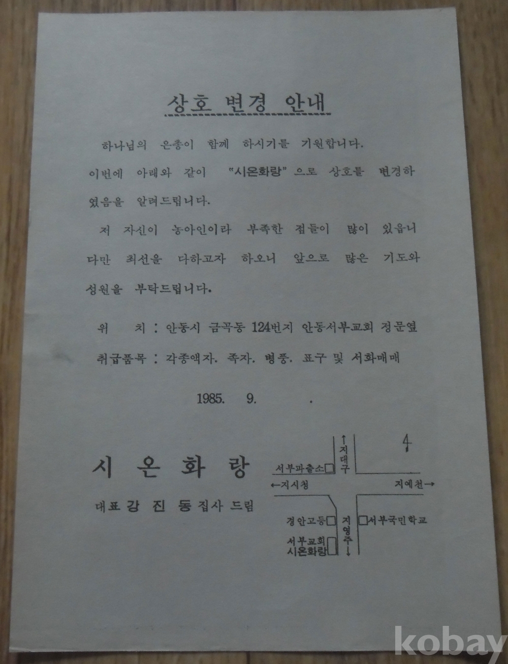 옛 전단지: 1985년 시온화랑 상호변경안내(안동)