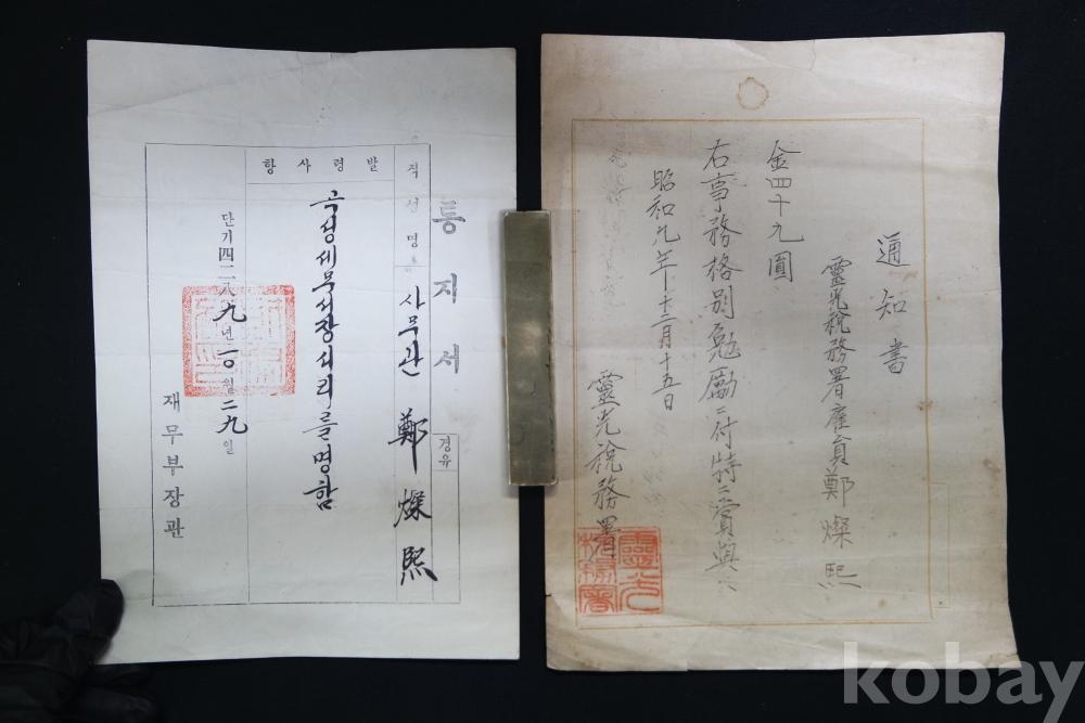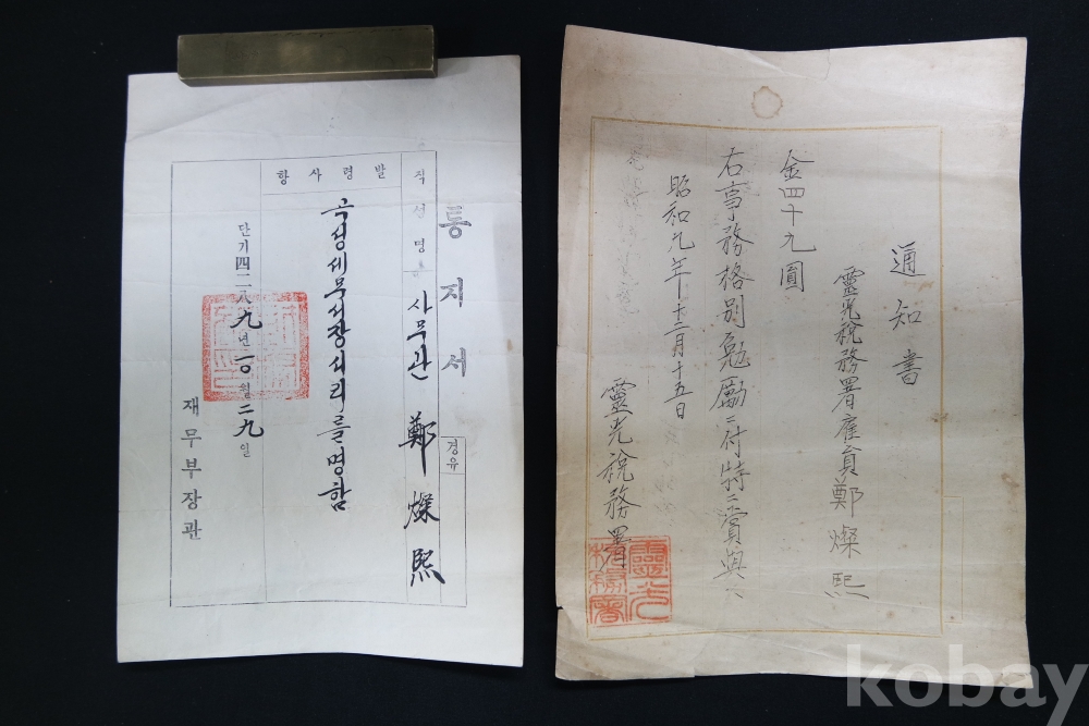 소화9년(1934년)에 영광세무서에서 고용원 최찬희에게