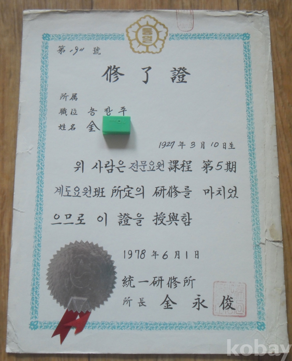 1978년 통일연수소 수료증