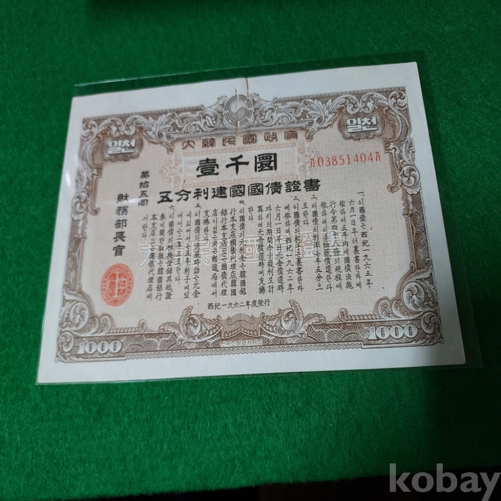 대한민국 1962년 건국채권 15회 1000원 사용제
