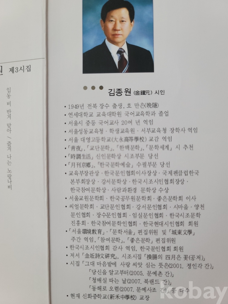 서경대학교 국문학과 & 연세대학교 교육대학원 국어교육과 졸업(金鐘元).
