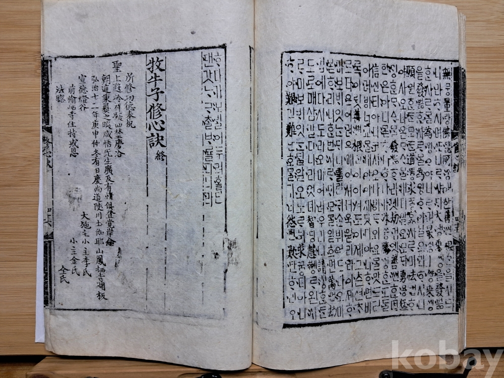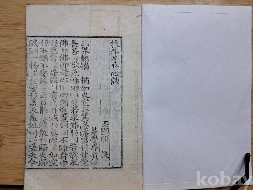弘治十三年庚申(1500) 伽倻山 鳳栖寺板으로 후쇄한 지눌(知訥) 著 [목우자수심결(牧牛子修心訣)] 單冊으로 책말에 9張 분량의 [法語]가 合綴되어 있다. 후쇄본이나 임란 이전 초기 한글 연구 자료로 상당히 중요하며 표지 개장 외 기타 보존 상태는 양호하다. |