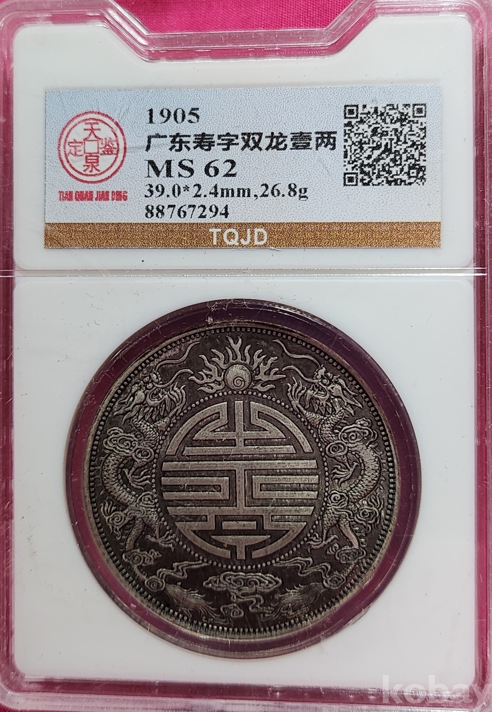 1905 년 큐알코드(QR CODE)가 함께하는 은색 광서원보 (光緖元寶)' 화패로 밀봉된 상태입니다,