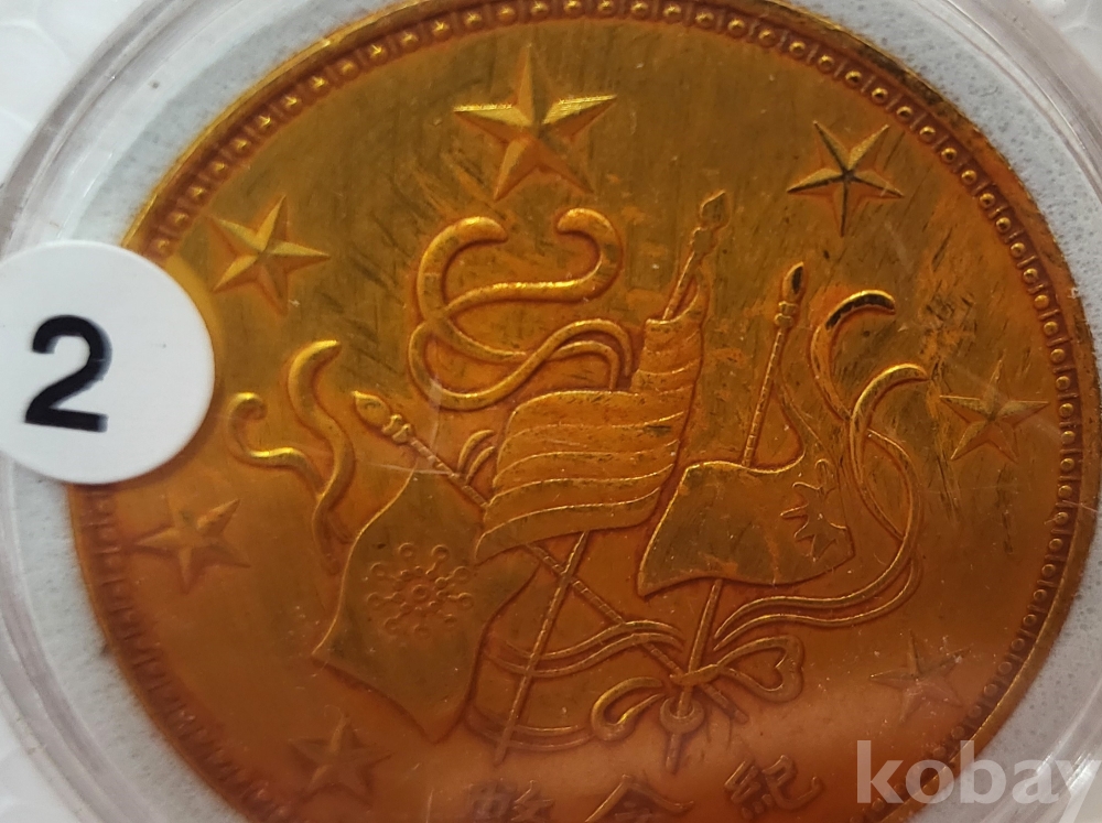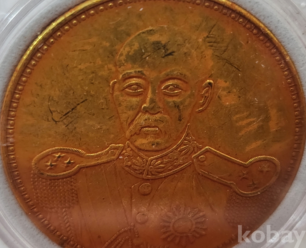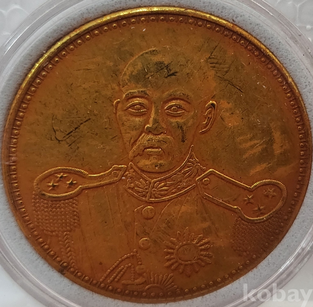 중화민국 초대 총통 원세개 초상 기념패 표기가 보이는 금색 주화입니다.