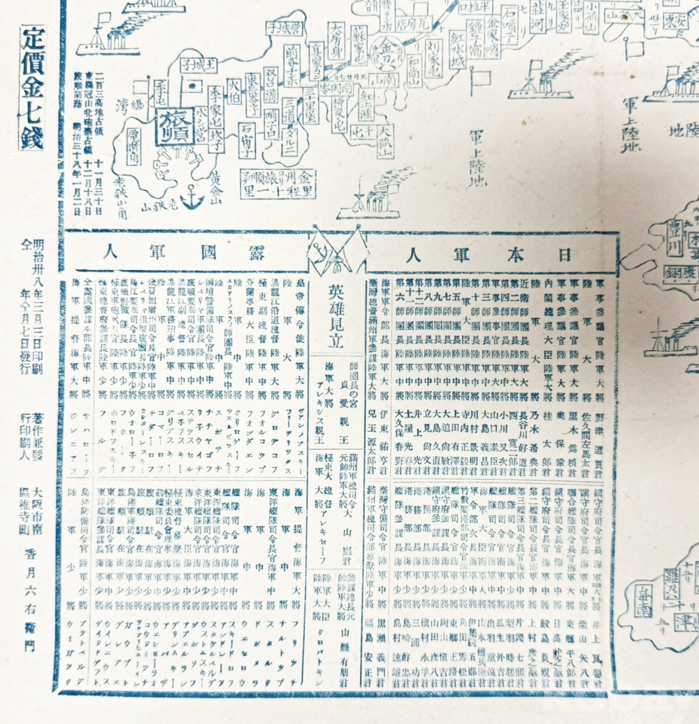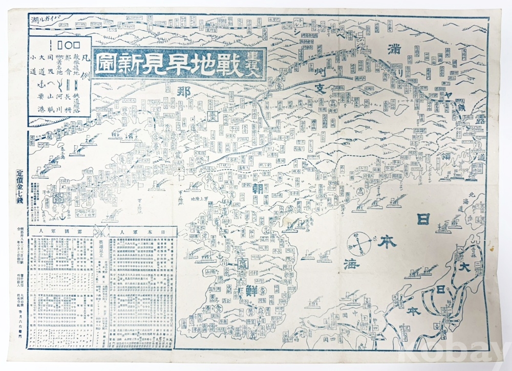 상품 설명 | 1905년 발행, 러일전쟁 기간 전장을 표기한 지도로, 일본군과 러시아군에 관한 도표가 하단에 수록되어 있다. | ||