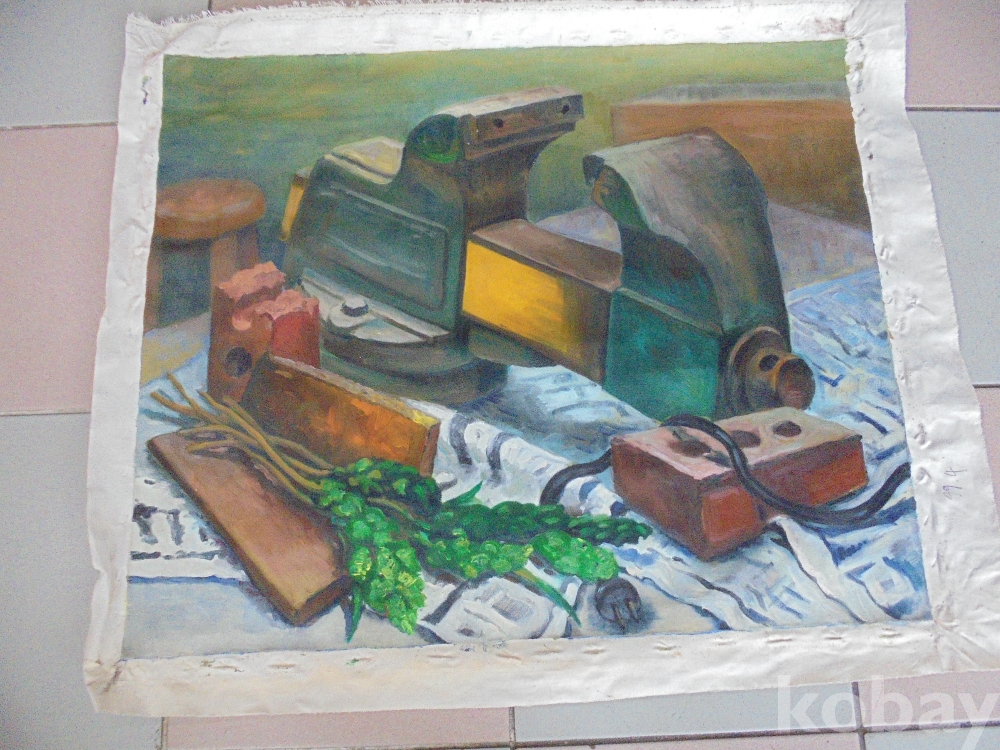 육중한 바에스 깨지고 안깨진벽돌 삼발둥근의자 채소등 다양하게 선명하게 실물처럼 잘그린 완벽한 정물유화