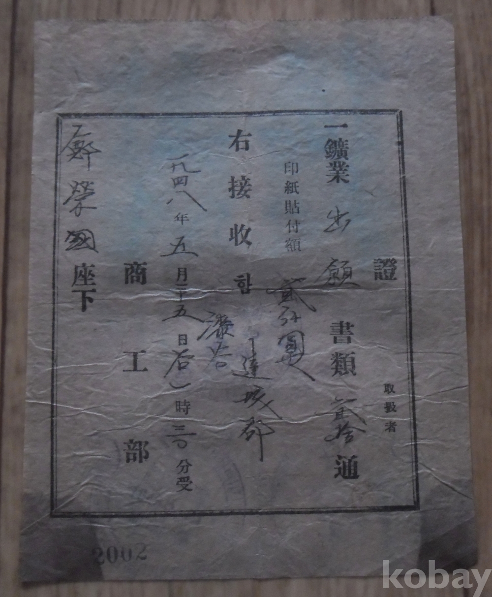 1948년 광업출원서류 관련 상공부 발행 영수증