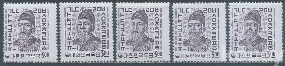 (한국우표-14)1964년제1차국산백지보통3원세종대왕5매(미사용제)-MNH, VF