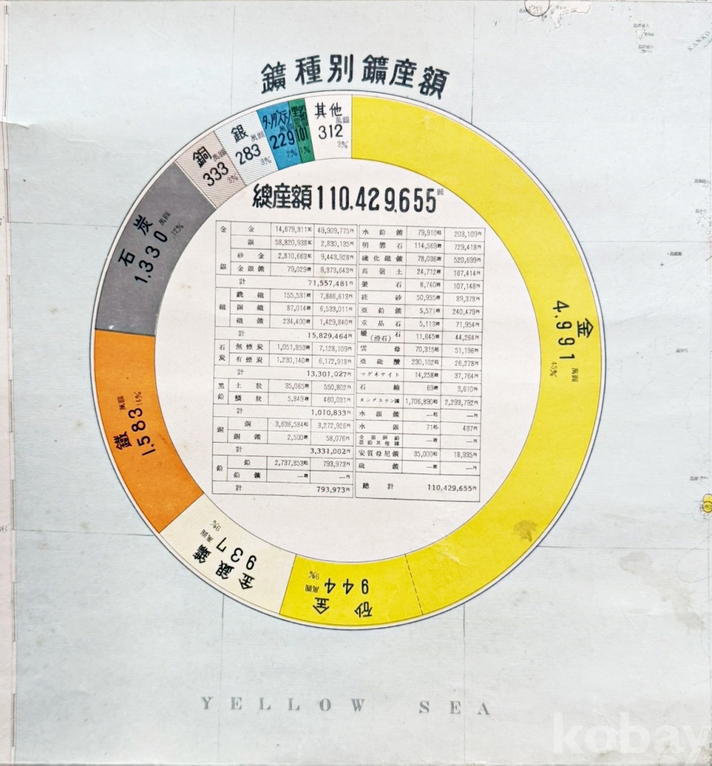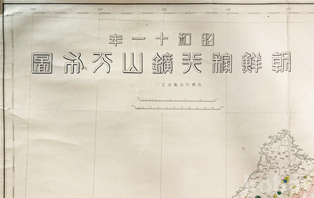 상품 설명 | 본래 1936년도에 제작된 광산 분포도이나, 본 출품물은 그 자료를 1938년에 발행한 지도이다. 조선전도 위에 금·은, 사금, 아연광, 동광, 철광, 무연탄 등의 광물 분포 내역과 광종별광산액표, 광종별가행광구수, 범례, 축척비 등이 표기되어 있으며, 하단 왼쪽 부분에 발행일, 제작자, 발행처 등이 함께 실려있다. | ||
